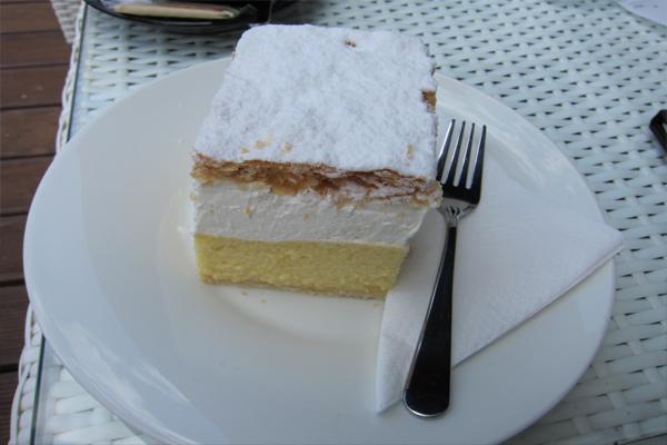 原先以為鮮奶油蛋糕再怎麼厲害也不可能多厲害,所以抱著把它當成觀光行程的心態點來吃,沒想到觀光區也是會有令人驚豔的美食!柔黃色的香草卡士達打底,抹上等高的白色鮮奶油,蓋上金黃酥脆的千層派皮,最後再灑上厚厚一層細糖粉,切成恰到好處的四方形。不論視覺上或口感都簡單又有層次感,甜而不膩,配上眼前的湖光山色,幸福的滋味盡在不言中。也許有人會覺得這麼簡單的東西,應該怎麼做都好吃,但是在前一站 Pula 的咖啡店裡,黃色卡士達跟白色鮮奶油是被當成兩款不同的內餡分開來賣的,當時點了一個卡士達口味的來嘗嘗,外觀幾乎一模一樣,但味道還是差了一截,布列德湖大勝。