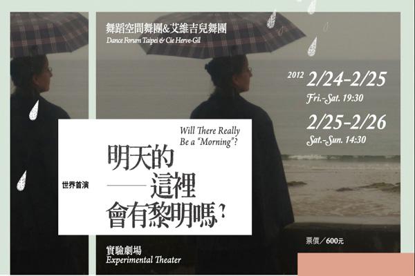 《明天的這裡會有黎明嗎?》是臺灣「舞蹈空間舞團」以及法國編舞家艾維吉兒(Myriam Herve-Gil)跨國合作的作品,全劇雖以美國女詩人艾密莉.狄更生(Emily Dickinson)為主題,但說的不是她的生平,而是她字裡行間的意境、失落的愛情、生命與死亡的遲疑,是她輕快的文法、小女孩般自言自語的念頭、是破折號和大寫的字母。