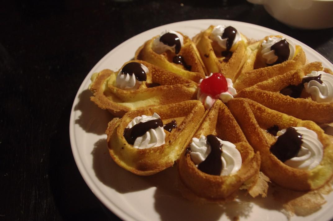 小時候愛吃甜,於是點鬆餅的習慣延續到現在,一直戒不掉。覆盆子鬆餅、冰淇淋鬆餅、花生鬆餅……選項有許多,我卻獨愛巧克力鬆餅。現烤的鬆餅值得等待,這裡的烤模使鬆餅美得像一朵盛開的花,餅甜甜脆脆的,裡面卻有紮實的口感,熱呼呼的上桌,咬到後面冰冰濃密的鮮奶油,一瞬間明白了甜點果真擁有療癒人的幸福感。其它的套餐,牛奶鍋、咖哩牛肋、田園香烤雞腿、橙汁排骨,也都是從小不變的味道。餐後的咖啡凍,上面擠個漂亮的鮮奶球花,又灑上杏仁片,是一餐最完美的句點。