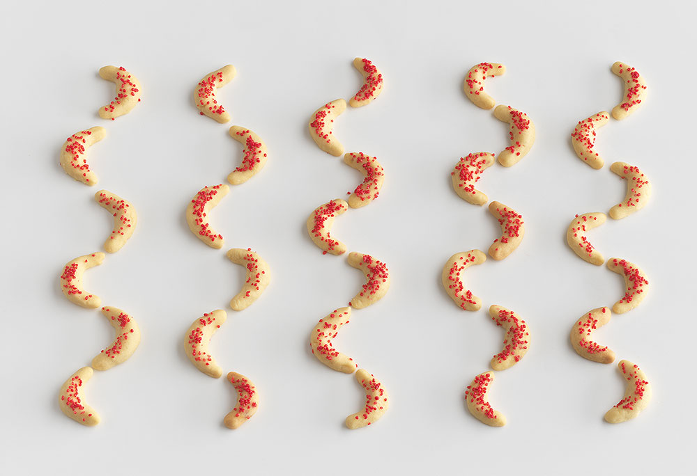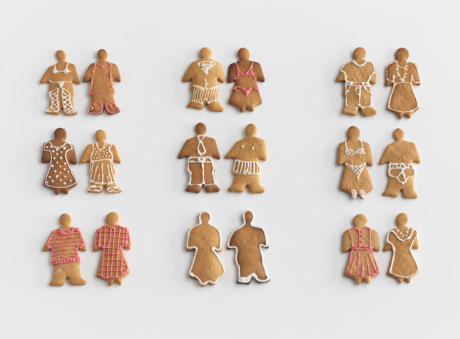 Pepparkakor 薑餅人:用模具壓出薑餅人的造型,並為每一個薑餅人穿上不同的衣服,雖是規矩的成雙成對排列,但衣服的巧思提高了畫面的趣味,並且讓人會心一笑。