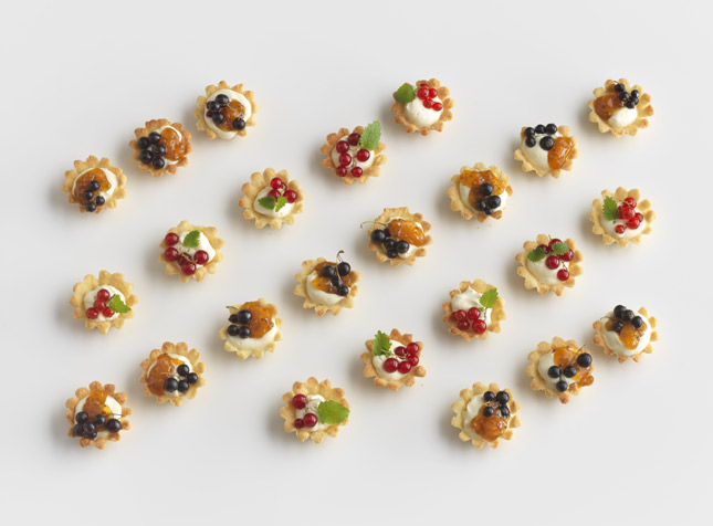 Mandelmusslor 杏仁餅乾:成品的擺設以斜線的排列構成矩形,上頭多樣的水果,以不同的顏色帶來變化。