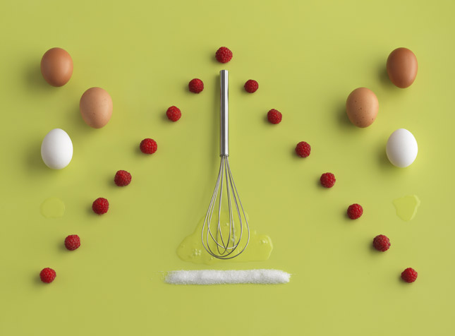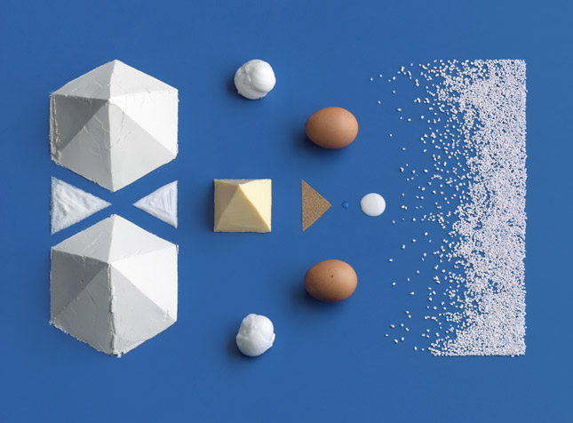 Hallongrottor 覆盆子餅乾食材:雖是矩形的集合,但其中仍有許多細節上的變化,如覆盆子點狀的排列成矩形、條狀的奶油、以及兩大匙果醬的上下顛倒,和六角錐的麵粉;原來食材的攝影,也能這樣變化!