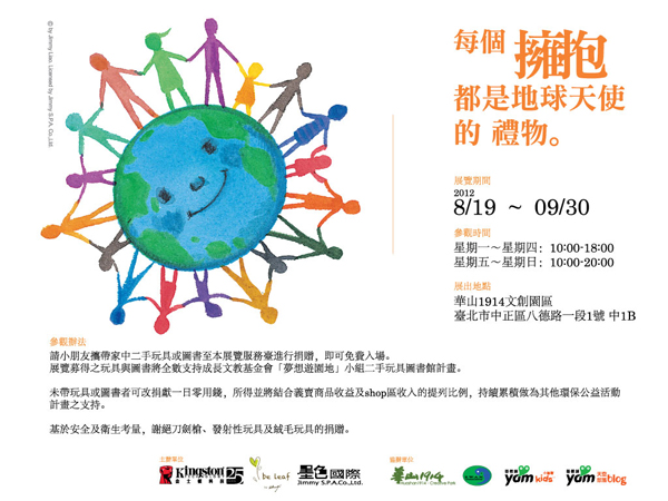 這個展覽除了延續支持成長文教基金會「夢想遊園地」,也將投入相關的環保推動計畫,希望大家能以擁抱代替破壞,因為有了愛,每個人都可以是地球天使。