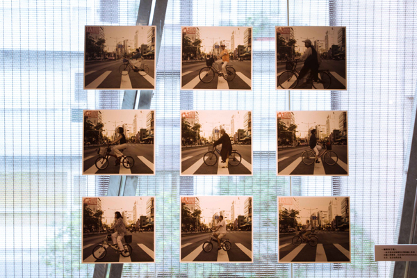 不同的時間,相同的地點,玻璃牆上貼著九張不同時間中在羅斯福路上拍下的人物剪影。攝影師站在同樣的定點,拍攝正騎乘著單車過馬路的都市人,有男有女、有主婦也有和尚。即便背景相同、行為類似,每個人騎車時都有著不同的樣態。「大人物」在這次「城市單車新生活攝影展活動」展出的攝影企劃有趣地呈現出都市人在城市中形形色色的單車生活。