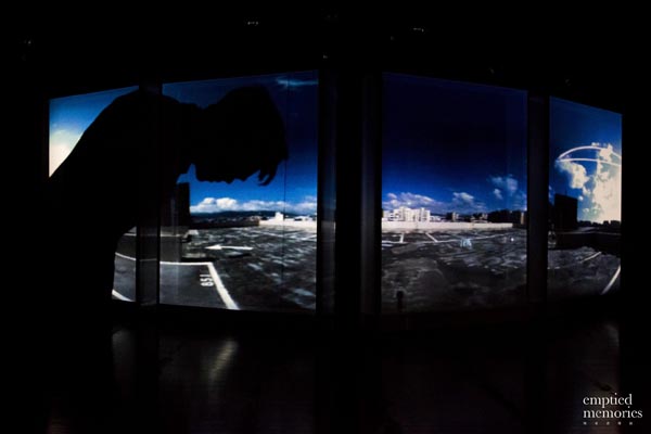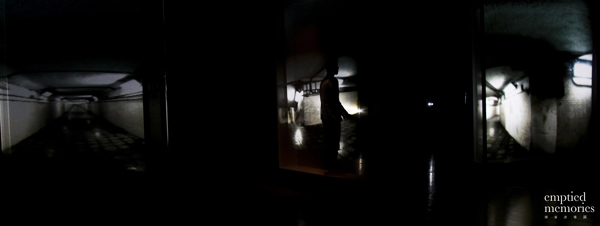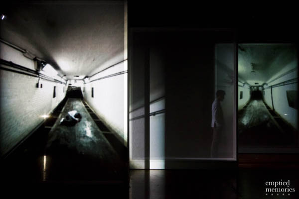 《空的記憶》一開始是從一首詩出發的,當時我有個想法,關於影像播放結束之後,還會發生什麼事呢?我和書毅聊聊這樣的概念後,慢慢的發展了更多細節,並決定要使用環景攝影。我們拍了火車、夜間的公路,更生活化一點的側拍了西門町,每次拍一拍就再回來討論,再計畫,再繼續去拍。還拍了台北一個空無一人、特別長的地下道,還有家樂福,吃的、喝的、生鮮、3C、網路、按摩椅、成衣,家樂福什麼都有,都很大量,書毅就穿梭在其中跳舞。也拍了一些比較抽象的,例如工地,我們剛好拍到一個正在建的游泳池,所以就是一個灰色的窟窿,形成一種夢境式的探索旅程。