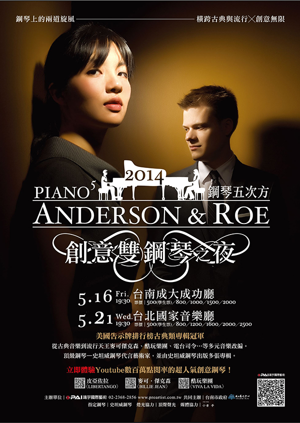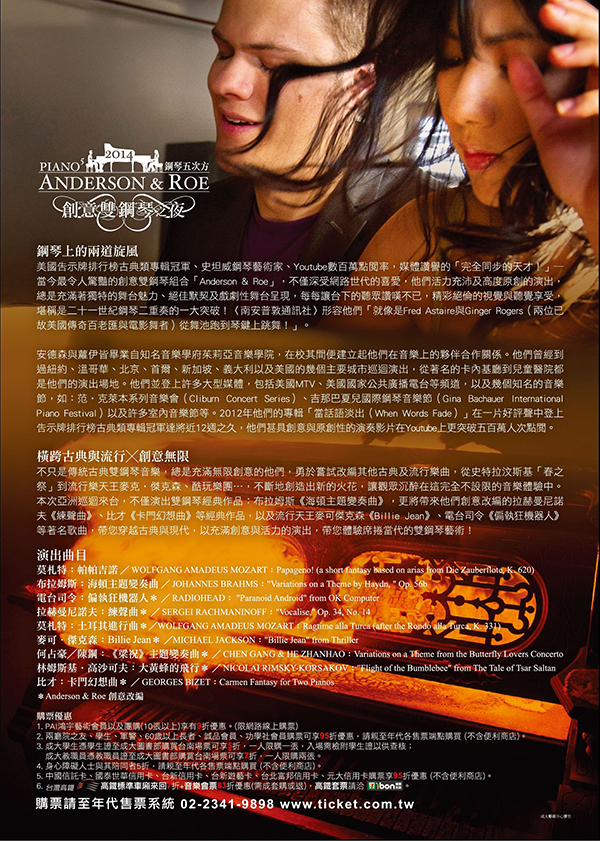 見過梁山伯與祝英台在琴鍵上彈情說愛?傳奇天王麥可傑克森在琴鍵上跳起月球漫步?Youtube 突破數百外點閱率、美國告示牌古典類專輯冠軍、挾著深獲網路世代喜愛的強大氣場,Anderson & Roe 將再度魅力登台,以雙鋼琴帶領聽眾從莫札特到電台司令,縱橫音樂 300 年!