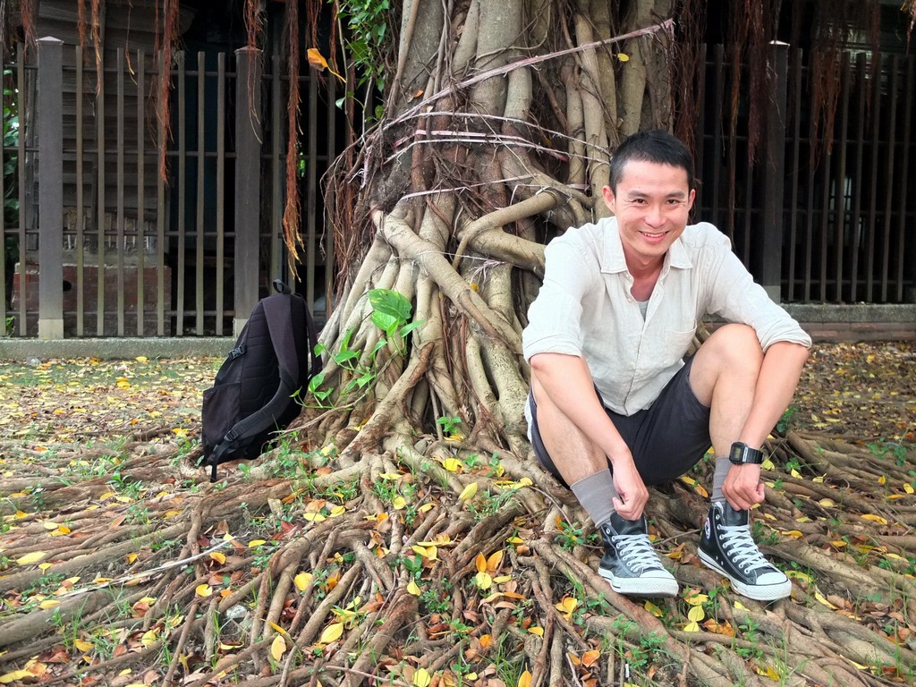 採訪結束的幾天後,你把當日一個片段畫下來傳給我,做為你今年開始進行的描繪日常感懷的圖畫日記之一:你蹲坐在青筋似浮出地面的老榕樹根上,表情還不知往哪兒擺的時候,我便在旁邊頤指氣使地要你把背包挪出鏡頭。看完我一陣莞爾,畫中的你就是現實的你,沒什麼好著急,沒什麼好焦慮。率真素樸的筆觸,連帶讓印象裡當時的天色都變得甘甜溫淳,像《泳漾》裡主角小胖的代表色,像你請我喝的小攤子上那杯甘蔗汁,黃色,是你心中最和煦的顏色。