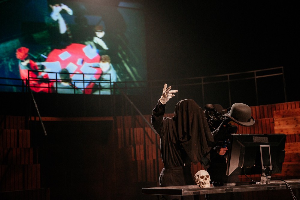 達文西畫作《最後的晚餐》裡橫列的餐桌,猶大後傾著身體,目光彷彿迴避耶穌、伸手正抓著前方的餅——類似的構圖在王嘉明劇作《理查三世》一場宮廷宴中猶仍可見。由人偶與攝影機組成的理查,正準備策畫一場背叛兄弟情誼的鴻門宴,宮廷的外戚也各有著自己的盤算。一場又一場充滿心機與詭計的宮廷殺戮,在舞台上演出。「永遠的背叛者」理查三世,在這場戲中是不見人形的。他以偶戲方式現身,雙簧口白由演員謝盈萱配音,這聲/身分離的表現手法雖然延續著去年作品《理查三世和他的停車場》,但是偶具不再是劇中瑪格麗特的女性角色。這次王嘉明版本的《理查三世》,主要的敘事軸線由理查三世的偶戲帶動,劇本也不如上回亨利六世的比重,不過仍有其影響。