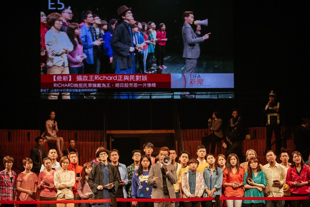 當我們說「Word is World, Word is War」被導演成功地處理,但亞里斯多德《詩學》中言說與景觀的「景觀」,事實上並未因為言說機制被挑戰而減弱,攝影的景觀無論是理查、彈幕或是 line 的出現,反而是被增強著。有韻的台詞讓現場所有的觀眾回復到了觀眾 audience 的詞源,還原成聽眾,但視覺的展示卻不得不接受理查舞台上的所有形象。這也就是為什麼上一版本的理查有血有肉,這個版本的理查則是符合原本莎劇中背叛者的形象,幾乎無法脫身。