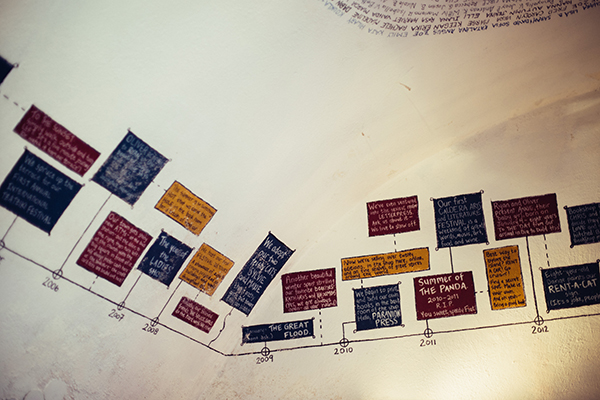 Atlantis Books 是由幾個英國人、美國人,與一位賽普勒斯女孩一起開的書店。起源於當時還在念大學的英國人 Craig 在 2002 時來到聖托里尼島度假時,發現島上觀光客這麼多,卻沒有一家像樣的書店。回去後慫恿同學朋友,幾個人畢業後花了半年時間存錢、去各個獨立書店蒐羅書籍、安排開店事宜,以巴黎的莎士比亞書店為範本,2004 年他們在聖托里尼開了這家書店。Atlantis Books 不僅是他們實現夢想的地方,也是他們在此生活、居住的所在,這些外地人在此成家立業,書店經營超過十年,店內不時在面海的露臺上舉辦各種朗讀會、文化節慶,同時他們也開始推出店內自有的出版品。牆上編年史甚至將他們何時養了書店的第一隻貓、狗都列了進去,旁邊還附註著「欸,我們沒有真的要租貓啦!」