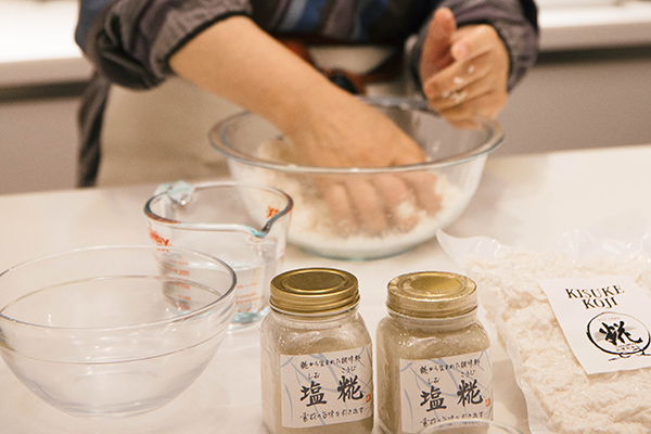 先將麴搓揉至完全分散後,再加入鹽一般來說只要用湯匙拌勻即可,但婆婆建議大家使用傳統的方式,用手一邊搓揉混和,一邊像母親照顧孩子一般地表達愛意。婆婆可愛的表示,因為麴是活的菌,把他們當孩子一樣,他們就會以香氣回應「我也愛你」,變成美味的鹽麴,否則吃的人會感受到鹽麴有怨氣。一直搓揉到成團狀,有香氣的時候,才可以加水攪拌,否則麴會淹死。加水的時候一樣持續搓揉攪拌,混和均勻就大功告成。