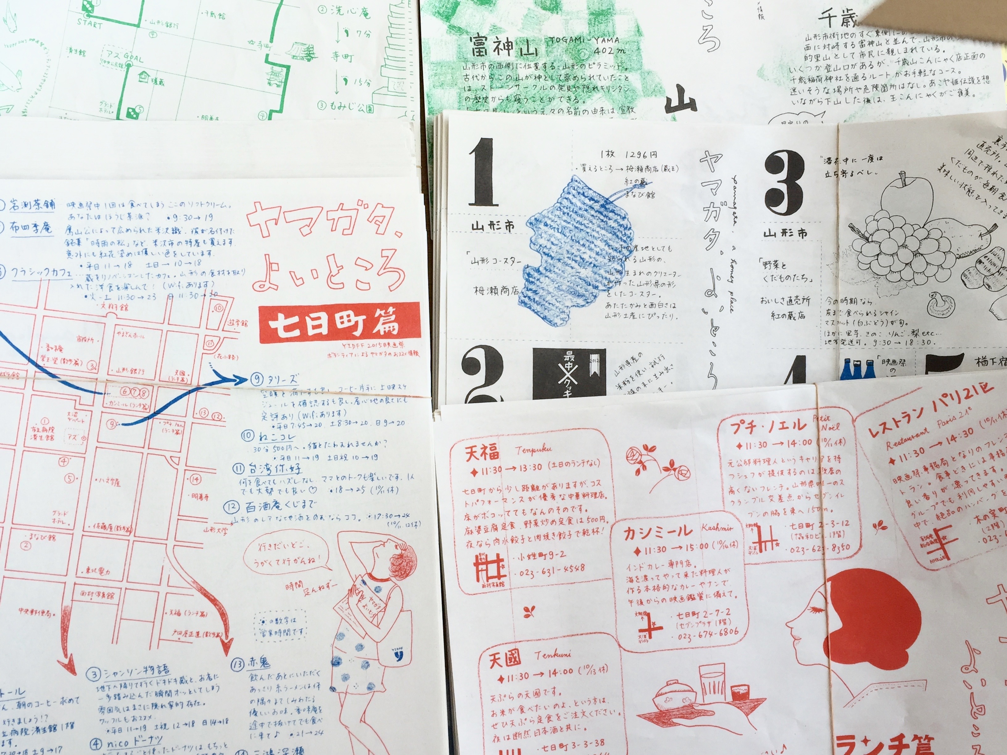 圖片:由山形影展志工手工繪製的市區主題地圖。一共有六款,包括「七日町篇」、「和菓子日本庭園散步篇」、「山形爬山篇」、「溫泉篇」、「土產篇」和「餐廳美食地圖」