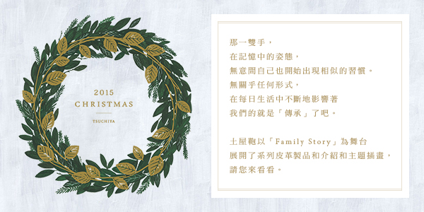 一年的尾聲,聖誕節來臨了。在這個溫暖的節日裡,希望喚起大家對於家族記憶的想念,無論是有形物件也好,無形思想也好,無關乎任何形式,在每日生活中不知不覺影響著我們並且在家族間流傳的事物,都是珍貴的傳承。
