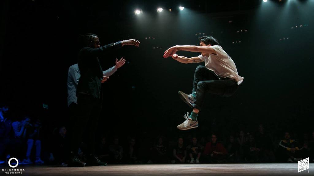 Simon Bus(右)於 2014年 「Open Your Mind」 與兩位跳機械舞的舞者鬥舞過程。「Open Your Mind」 是個歡迎各種舞蹈類型所舉辦的實驗性鬥舞競賽。Simon Bus 在 2015 年為荷蘭比賽的冠軍。