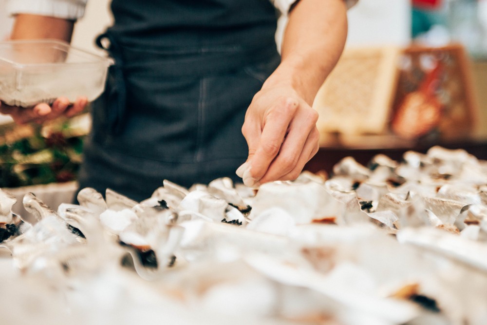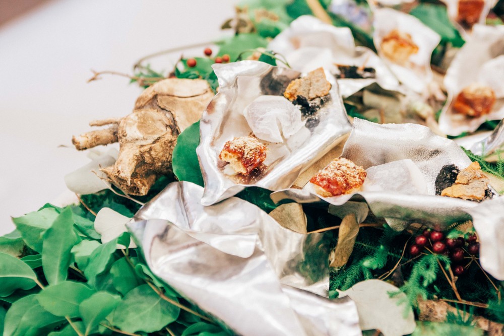 此次用來盛裝餐點的器皿,正是由翻玩百年傳統工藝的新星品牌 syouryu 隸屬日本百年老店「Shimatani 昇龍工房」旗下,入選日本「The Wonder 500™」後聲勢看漲的新品牌「syouryu」,原為專門生產名為「磬」的佛教法器工坊,透過專業師傅以鍛敲錫的傳統技法融合嶄新創意,利用100%純錫金屬的特性,經由手工敲製出獨特的紋理觸感,推出了足以逆轉制勝的「Suzugami(錫紙)」商品。柔軟如紙張般,擁有自由凹摺的特性,能激發使用者天馬行空的想像力,同時也擁有極佳抗菌作用的優勢,看著金鐘主廚 Joël 喬艾爾加了點玩心的示範,彷彿落葉般的錫紙盤,大膽玩弄於股掌間的藝術便油然而生
