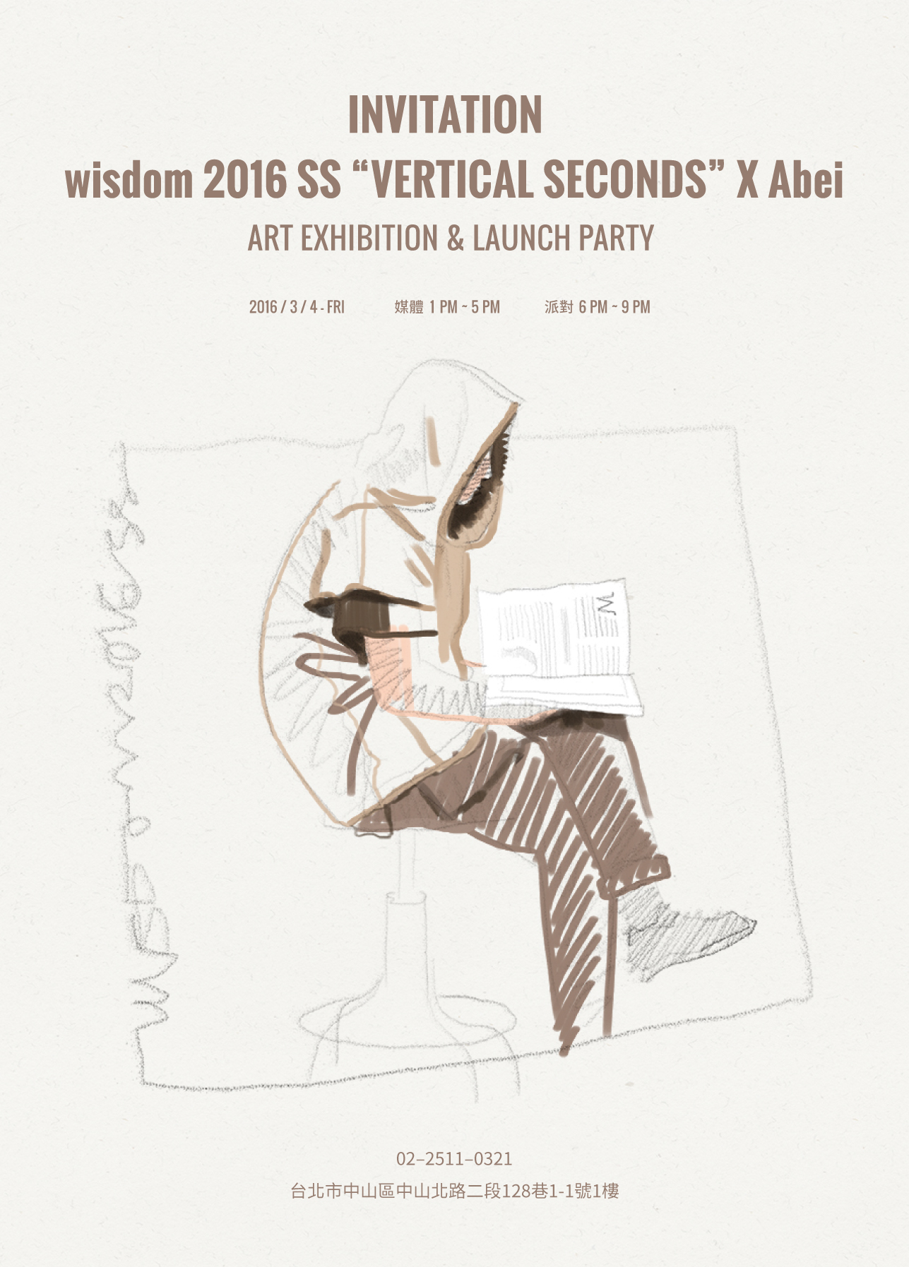 wisdom 2016 春夏季度主題形象 “VERTICAL SECONDS” 正式發表,延續其藝術創作概念,請來藝術家 Abei,將原先延伸自畫作色彩、線條的服裝設計,重新以解構結構的手法進行創作再造:融入了手繪感的平面插畫;結合服裝面料、車縫線與畫板;層疊木板切割等等立體創意製作,體現出今次品牌春夏系列的藝術印象,從色塊拼貼的組合與幾何線條的層次勾勒;到以不同服裝面料展現出畫作主題的造型感,全方位帶出致敬主題的服裝藝術匠心!