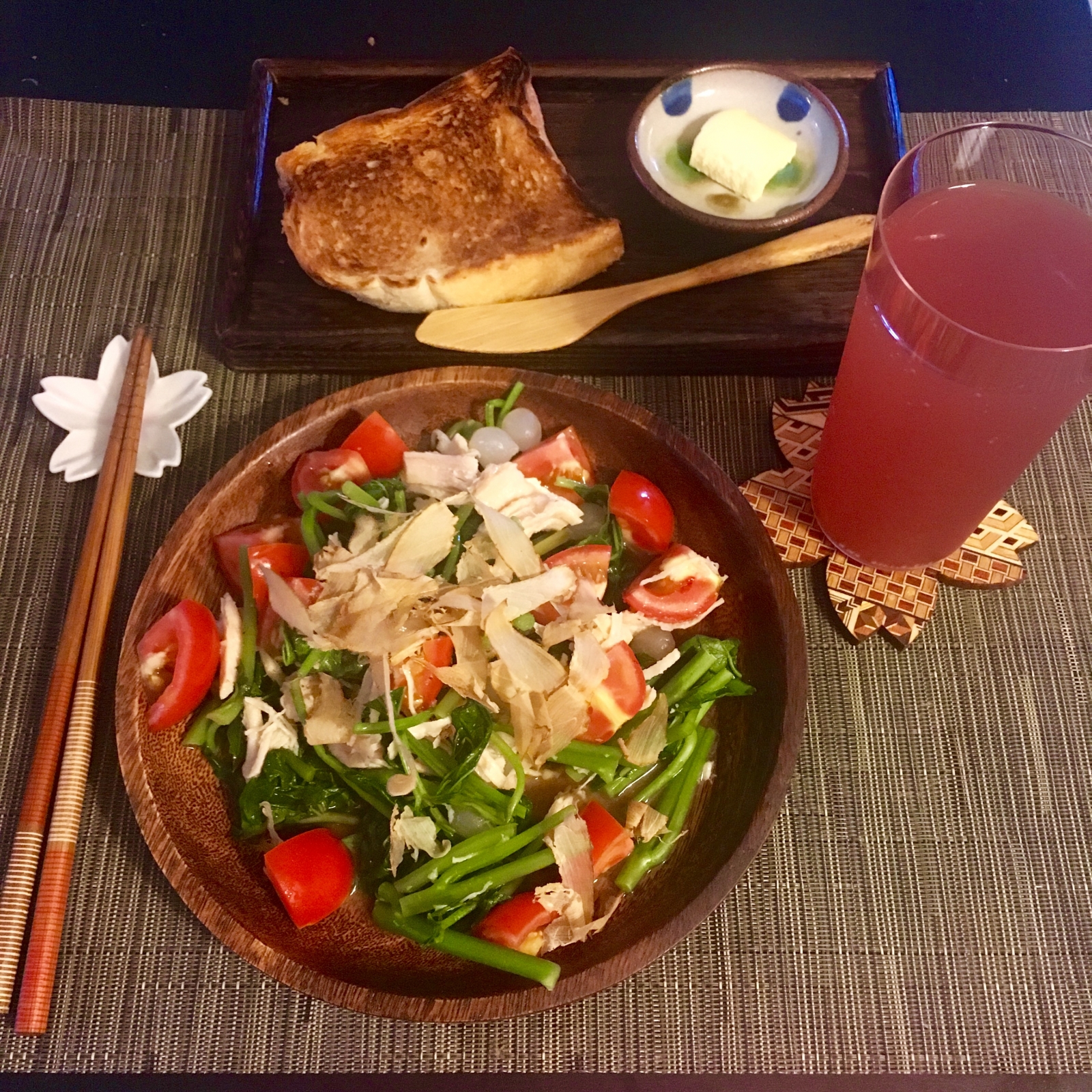 今日運動回家,天氣悶熱,人又懶散,突然靈機一動。也許可以做成和風溫沙拉,於是打開冰箱,拿起番茄、柴魚片、Costco 水煮雞胸罐頭、醃製珍珠洋蔥搭上汆燙過的地瓜葉,淋上紫蘇和風醬,一個雜牌溫沙拉就誕生了,可惜家裡沒有冷豆腐搭配,不然滋味更佳。這一桌可能還不到五十塊,那無聊的地瓜葉,也突然有趣了起來。在保存期限的尾聲,突然有這靈感,可能是灶神或豐收女神,感受到我對食材的執念,給了我條退路吧!討厭的地瓜葉多了點可愛,下次,打算拿它代替菠菜涼拌冷豆腐加上柴魚跟昆布醬油試試看,至於那令人困擾的梗,就切細碎跟絞肉炒成偽蒼蠅頭吃吧!