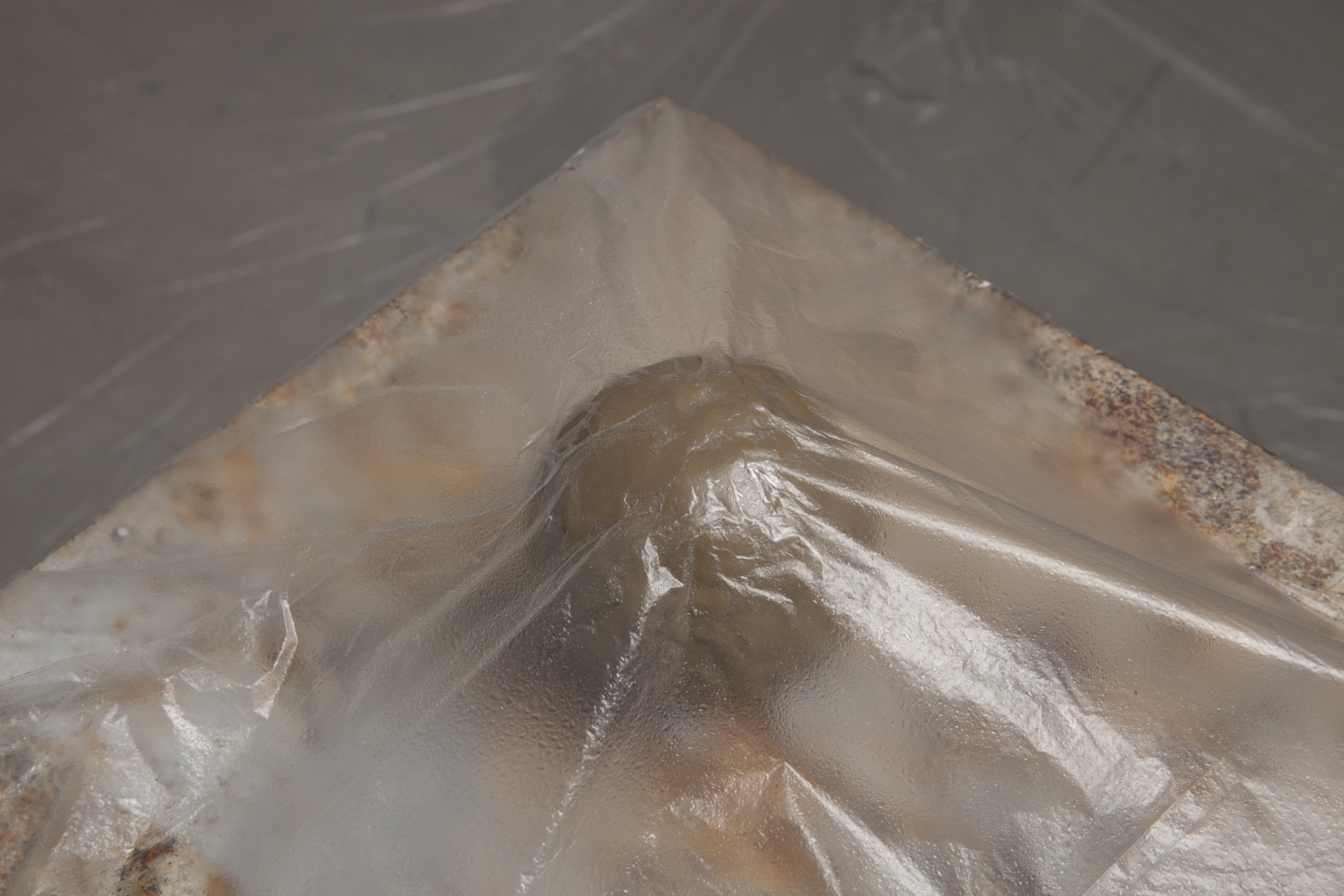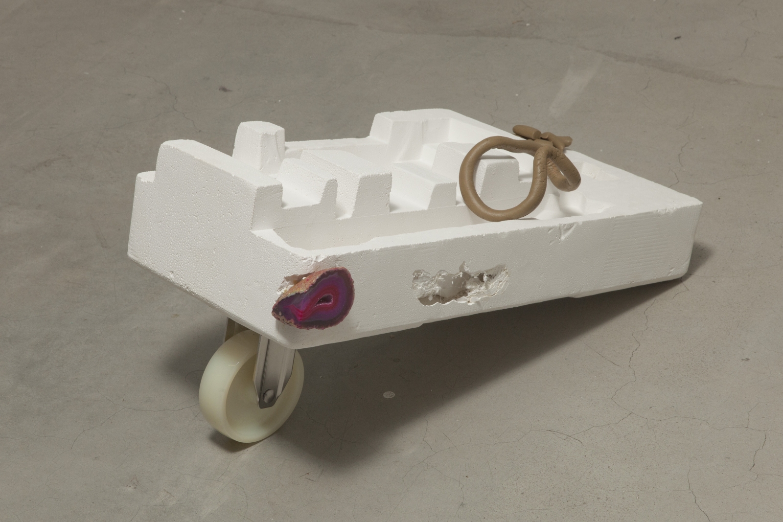 從藝術集合的全體到作品的過程之中,《地板項目》在以現成物為創作素材的羅智信手中,現成物的「現成」,是這個展覽的核心。現成,如何浮現出已製物的面貌是《Foam to Form》試圖透過用石膏來複製保麗龍的手法。在這裡,羅智信將以往藝術再現論的議題重新拉回了「現成物」的討論。透過金屬支架、木頭與保麗龍似的石膏,觀眾被拉進了媒材結合所產生的張力之中──這是一階觀察,直接對原本現成物的觀察產生了它純粹材質組合的美學效果。而從「形式到形式」而不是「形式與形式」的結合,則存在於二階觀察之中。從石膏翻製保麗龍材質的視覺經驗中,《Foam to Form》產生了現成物中「現成」的重探。假若現成物為假,作為組合成分的虛構性質,與其表達的整體關係又是什麼?在這裡,羅智信的《Foam to Form》恰似一種意向行為(Illocutionary Act)的方式(編按:請參考語言行動理論 Speech Act Theory),或者說透過虛構的手法來重探現成物是否也存在「真值」(truth value)。在這個展覽中,塑膠蛋和真的蛋殼、真的瑪瑙和仿製的假大理石重新思考了現成物的可能。