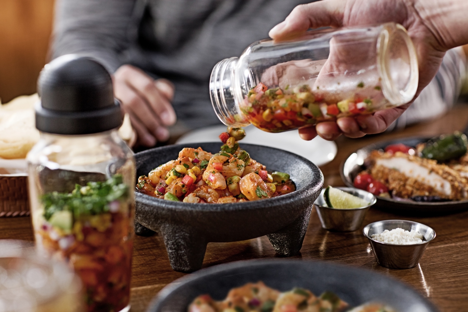 墨式手搖鮮蝦莎莎缽:爽口風味鮮蝦搭配鱷梨莎莎,手搖絕妙滋味,倒入獨特墨式石缽,淋上新鮮檸檬汁與羊乳酪起司,搭配香酥玉米脆片,沒有比這更適合 Party 了!卡滋!卡滋!香脆好滋味!