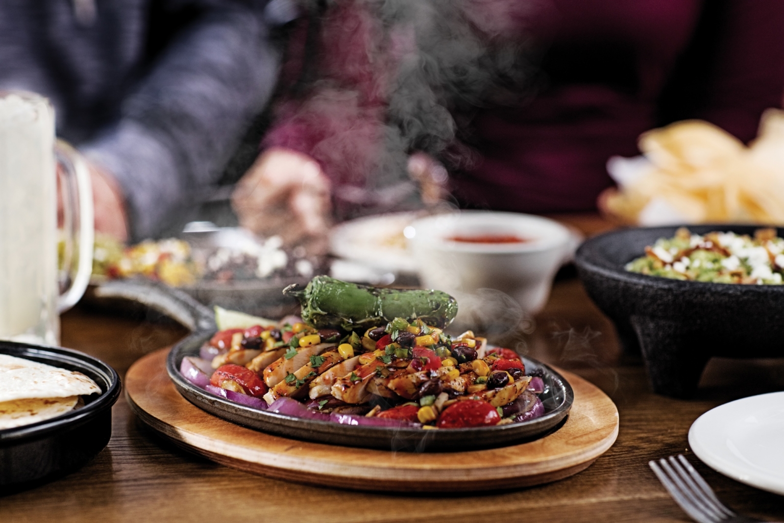 Honey-Chipotle Chicken Fajitas 蜂蜜燻辣嫩雞法士達:以焦糖紅洋蔥與香蒜番茄鋪底,搭配多汁嫩雞,淋上蜂蜜燻辣醬、溫熱玉米黑豆配料,撒上香菜,搭配萊姆角與香煎青辣椒,熱氣騰騰的滋滋作響,讓人回味無窮!