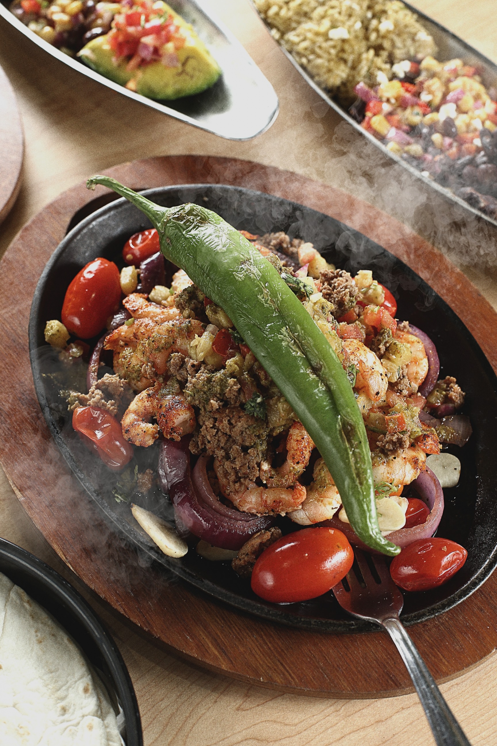 Roasted Shrimp Fajitas 香煎鮮蝦法士達:每一個人都想品嘗到的絕妙好滋味!以焦糖紅洋蔥與香蒜番茄鋪底,搭配香煎鮮蝦與墨西哥風味牛絞肉,淋上鳳梨香酸番茄丁與辣味柑橘醬;最後撒上香菜與香煎青辣椒點綴,讓人讚不絕口!