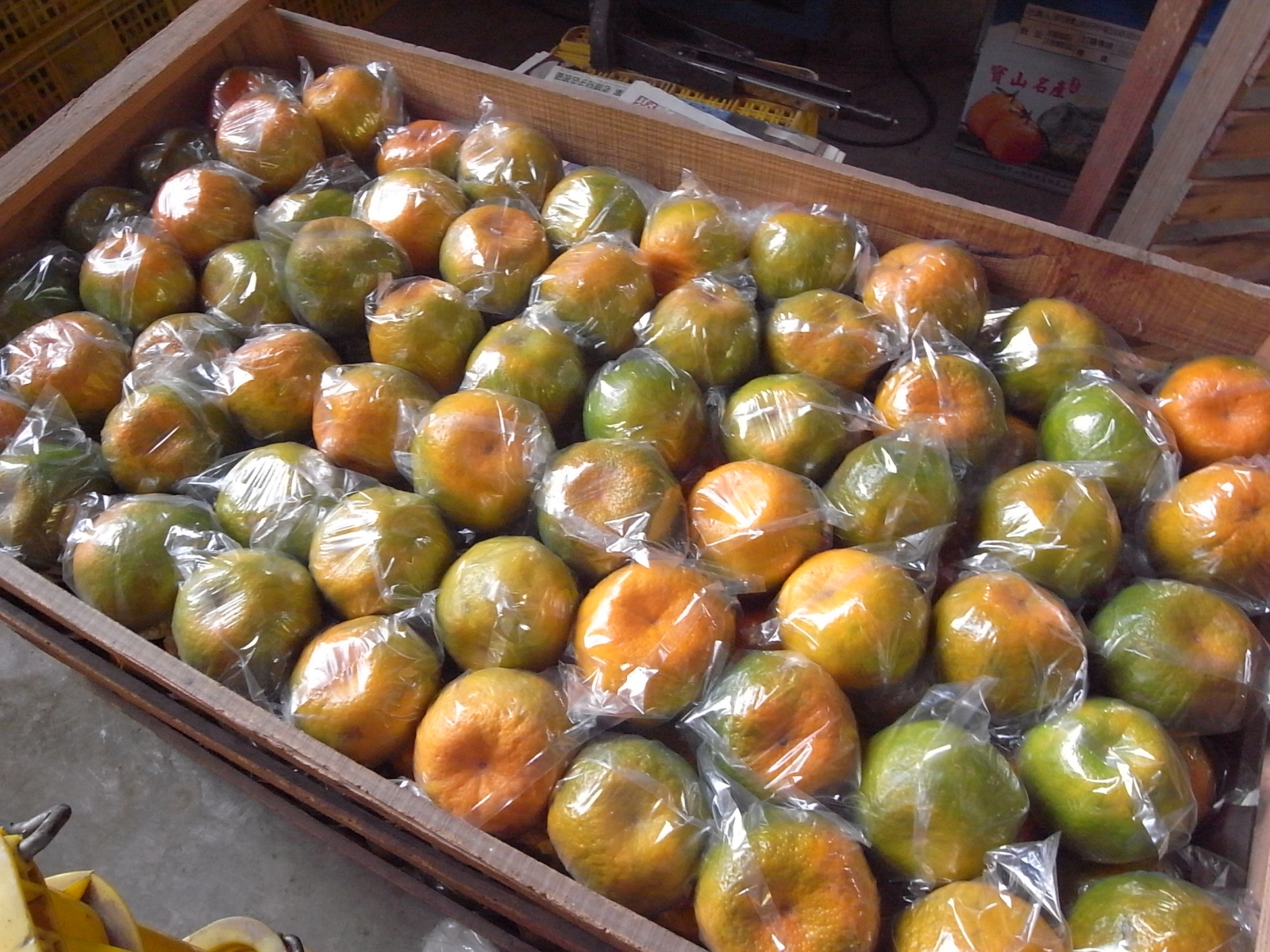| 為了延長保鮮期,分別將橘子套帶,除了避免氧化讓橘皮老化、也可避免壞掉的橘子互相傳染。 |