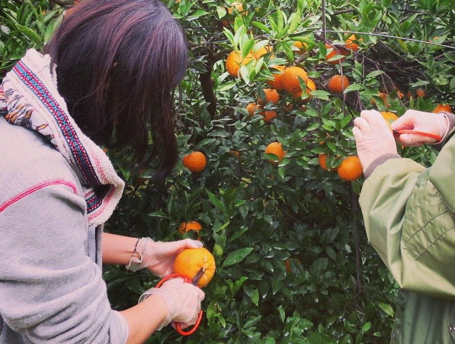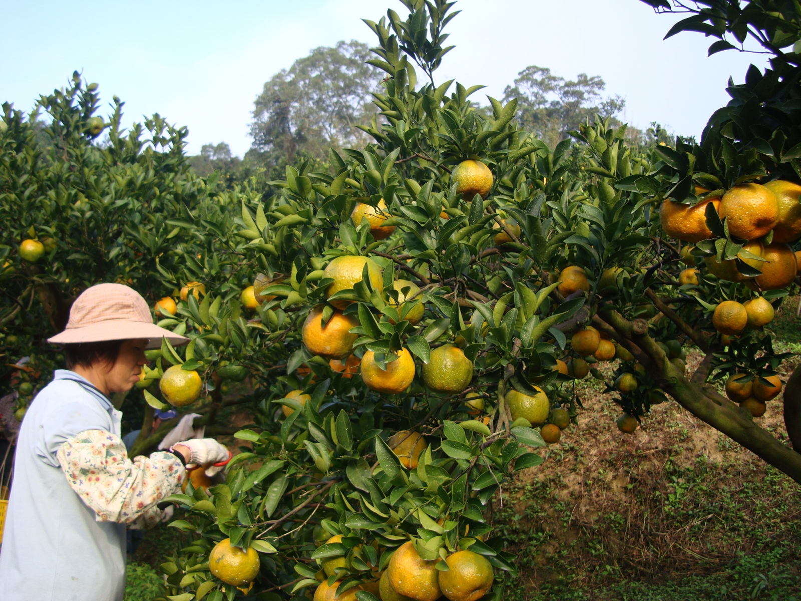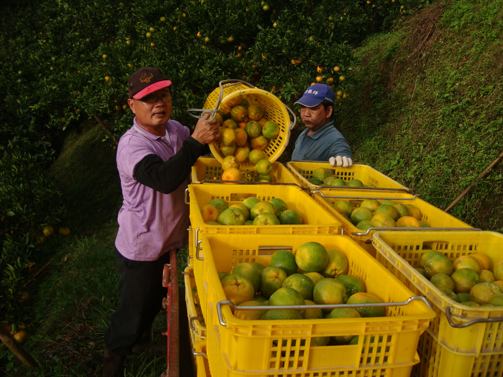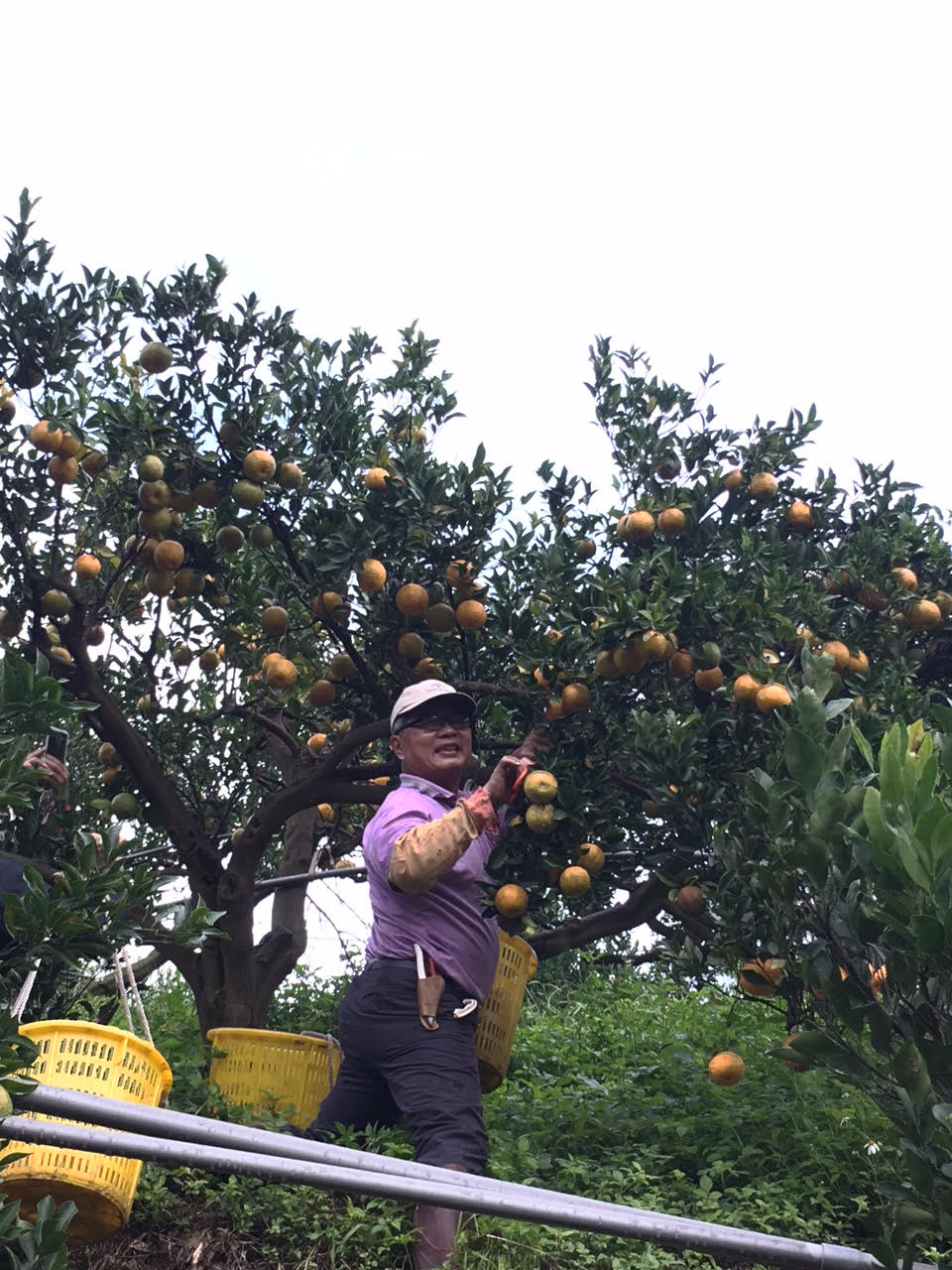余叔叔的果園是民國七十年開始種植,算一算這些果樹也三十幾年,園地近五甲之多,一眼看去的橘園規劃整齊、每棵樹也是根深葉茂、更別說樹上的橘子結實累累。今天主要來採的是「椪柑」,必須細心操作以免傷到成熟的果實,導致潰爛,日後儲藏時間縮短。我們將剪好的椪柑放在掛樹上的籃子,籃子滿了再倒入塑膠箱,排在農地上等待搬運車。這體驗可一點也不輕鬆,揹一籃 20 多台斤,扛一箱 40 來斤,真的得靠「實力」才能生存下去(實在的體力)。採收時,我也發現部分橘樹用竹子撐住樹枝,一問下才知道,原來果實多會怕垂落地面受損傷,也擔心果實過重將枝幹折斷,才用竹子一一撐起,避免容易掉果、爛掉,減少收成。