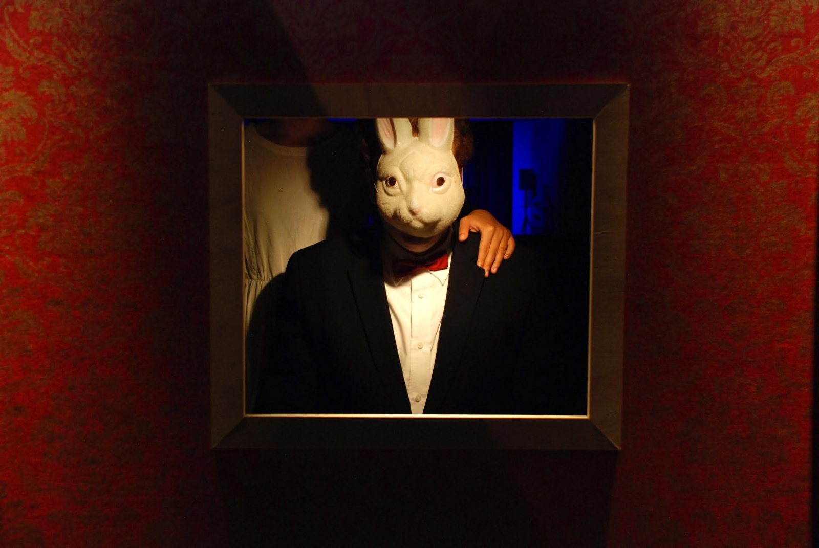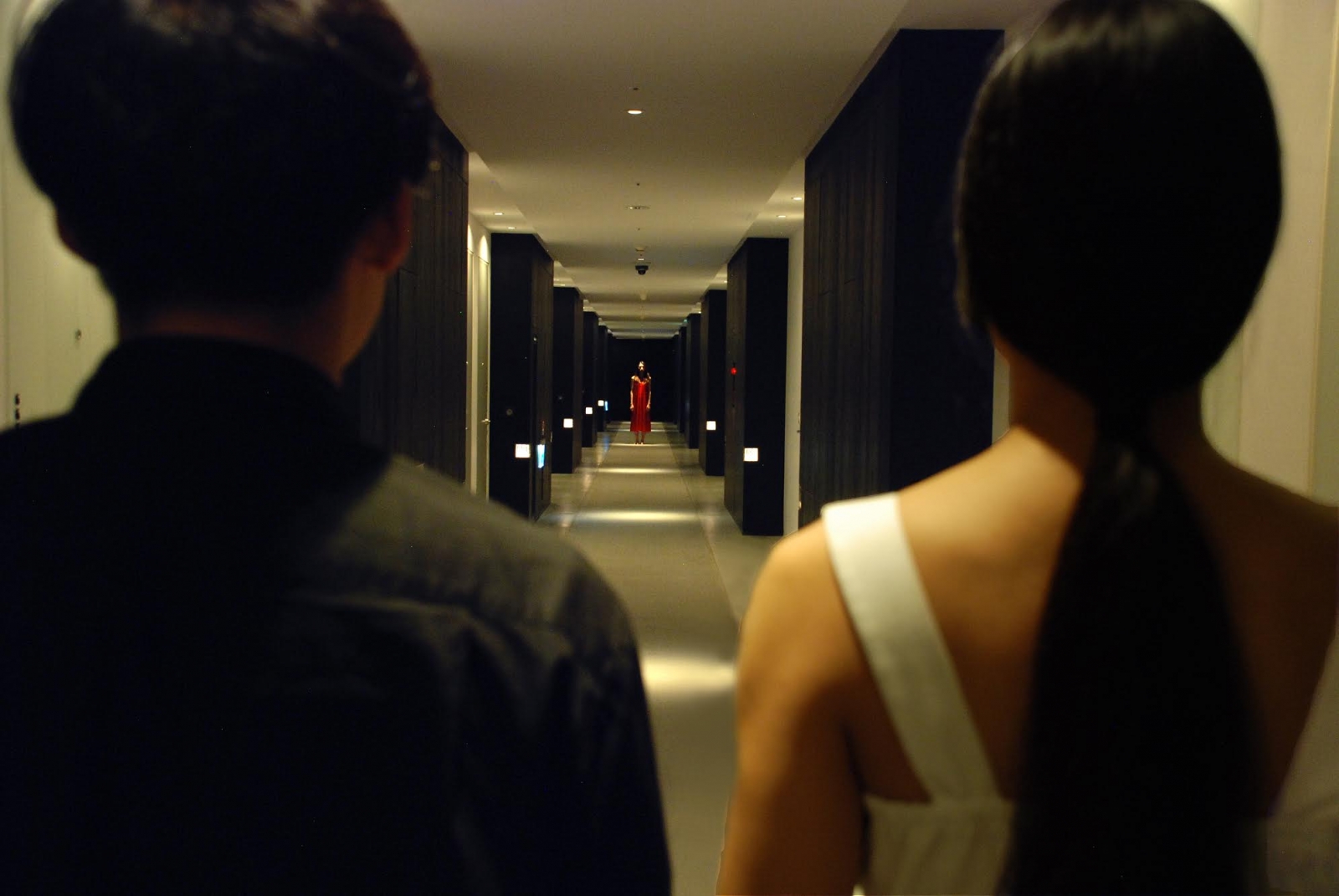 一轉頭,一副耳機將快樂和諧的旋律傳進我耳中,原本空無一人、毫無動靜的大廳這時充滿活力,嘴角不由自主上揚。突然冒出的老者、母親、親切的帶領者在我身邊「為我存在」,耳邊的聲音和包圍著我的夢中角色形成完整的圖像,我在圖像裡,也在圖像外,因為這一切背後有個呼之欲出卻無法摸透的秘密。被領入電梯,門關上後、音樂消失,門再打開時,在我眼前的是一面牆,粉紅色的巴洛克風壁紙微微反光。牆面上的小洞出現,我與夢中角色互敬了一杯酒,酒從我的嘴唇滴下來、流到脖子上。透過小洞,遠方有個人影在紅色帷幕的台上唱歌,是歡樂的音樂,但卻讓我想到大衛林區電影中相對悲傷的紅色帷幕空間。(註二)