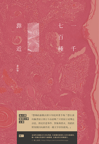 《一千七百種靠近》便是這些罐頭文學的型錄。裡頭有著各種不同的風味,愛情的苦澀、親情的酸楚,或者是不夠相信自己的怯懦。唯一不變的是原料皆來自網路另一頭陌生人的委託,來不及說出口、不知道該怎麼說的話,讓蕭詒徽為你寫下。三年多前,受到電影《雲端情人》主角職業「信件撰寫人」啓發,蕭詒徽開始接受陌生人請託寫下一篇篇文字。如此,文字不再虛無縹緲,而有了各自的重量,成為真實的連結。作者與讀者、委託人及其對象,以及翻閱書本的我們,都能被安放在同一個罐頭裡。