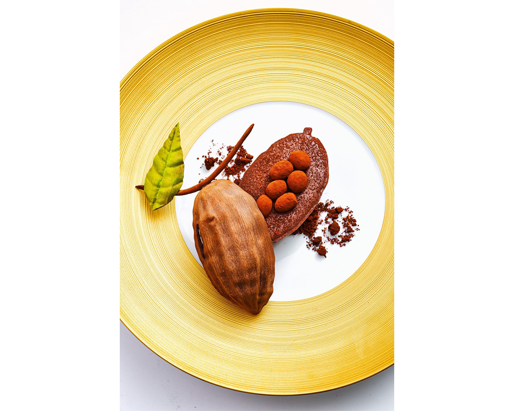 圖8. 巴黎五星級飯店 Le Bristol 前甜點主廚 Laurent Jeannin 的招牌甜點之一「Chocolat du Pérou」(秘魯巧克力)。他在盤子上用不同的甜點元素、口味與質地再現了巧克力豆的真實樣貌。注意盤子的選擇,不管是顏色還是設計都與甜點整體協調搭配、也完美地烘托了主題。(圖片來源:L’Express Styles)