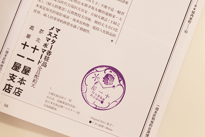 舉例來說,「十一屋」是位於城內本町的女性化妝品店,以目前街區來看就在西門町紅樓裡面。創辦人小口みち子除了是當年少見的女性老闆,本身還是明治末期爭取女權的運動家,在當年的婦女雜誌長期教授美容技巧,這種背景竟然有點後女性主義的味道,加上她的丈夫小口忠是知名電影導演,猜想這對夫妻大概就是走得很前面的那種吧。「十一屋」印章紫得貴氣,線條簡單且細,主視覺上一個高雅女性側臉,整體而言陰性氣質相當濃厚,頗具現代化妝品牌之感。