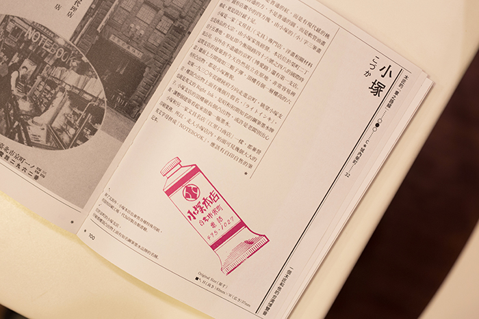 位於榮町二丁目十五番地的「小塚」,在目前的衡陽路上,身為一家文具及洋畫材料專賣店,洋風吹拂的店,用桃紅色印泥也不為過吧。紀念章形狀設計成軟管油畫顏料、老照片中清楚看見店內大大的「NOTEBOOK」標示,能窺探這間店的洋派風格,圓形店徽取店名「小」字三筆畫構成,亦是概念相當前衛的 logo 設計。