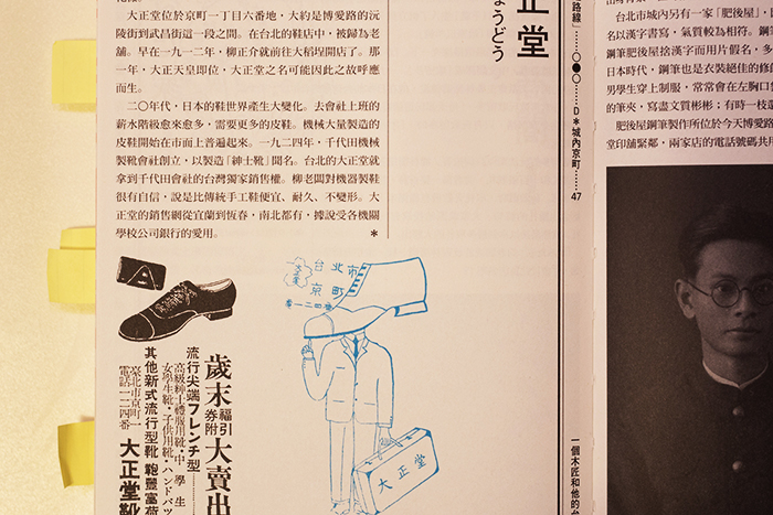 將一顆人頭置換成一隻皮鞋,這種怪異的惡趣味,當代年輕人應該也會喜歡吧?「大正堂」位於京町一丁目六番地,大約是現今博愛路附近,因應當年去會社上班的薪水階級越來越多,手工皮鞋供不應求,業者開始改用機械製鞋,而「大正堂」對於機器製鞋可是很有信心,說是比手工鞋更加便宜耐穿,剛開始以機械代工的二〇年代,和現今以漸漸崇尚手工的社會氛圍似乎很不一樣。