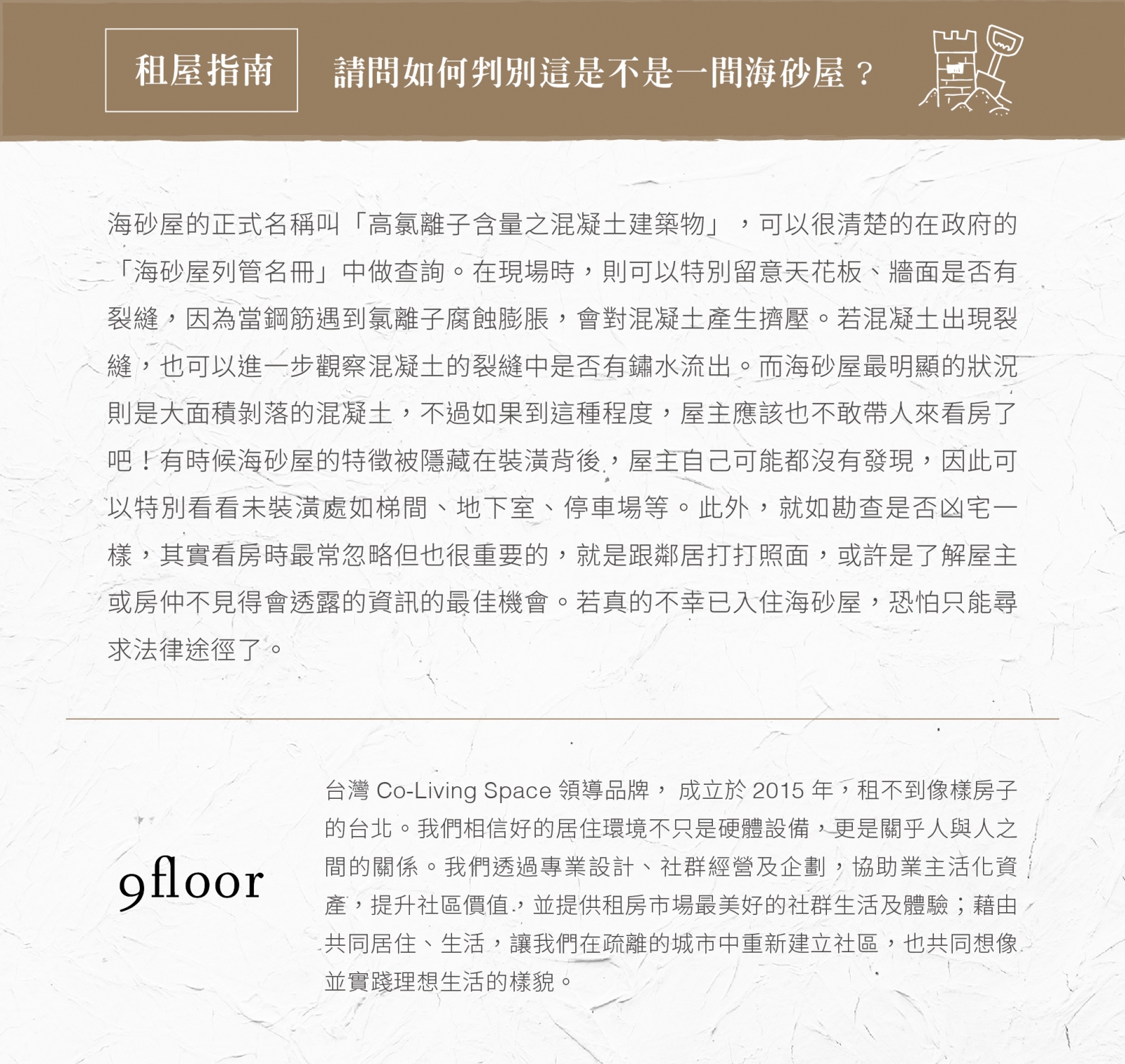 畢業後與幾位同學在新店租了間三房一廳的社區大樓六樓,房東主打生活機能,這也沒錯,因為下樓就是臨大路的菜市場。這是間正常的房子,只是住在這裡我才知道,原來蚊子與蟑螂是會從排水口入侵的。他們沒有騙我,只是我應該要知道有一好沒二好。住了一年,幾位同學各自有人生規劃決定不再合租,長輩聽聞我在台北找房子遇到困難,便主動將確定都更但時間不明的電梯華廈海砂屋便宜租給我。