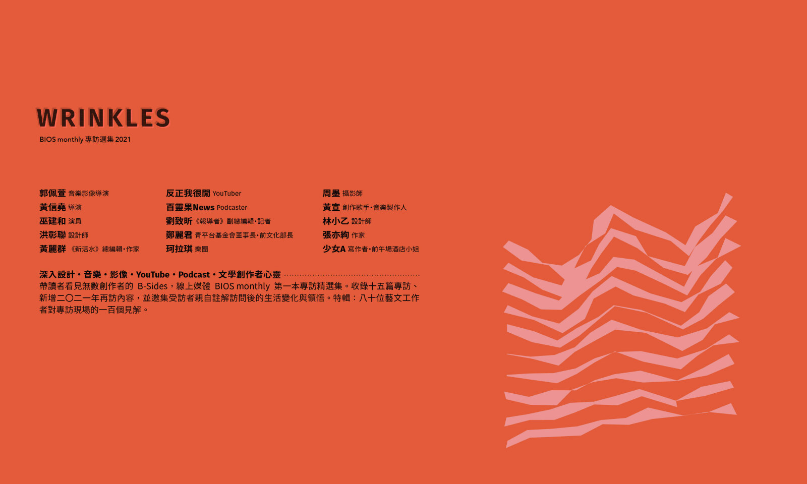 Wrinkles|只是用和阿嬤交談的方式寫歌——專訪珂拉琪 夏子沒想到爆紅之後,家人倒成了鐵粉,父親每天必刷珂拉琪 YouTube,回報最新留言。相形之下,最初邀請夏子一起做歌、催生珂拉琪的王家權,反而沒有這麼幸運。 Wrinkles|剛好我們是那種比較沒出息的人——專訪「歡迎光臨午場酒店」少女 A,愛就是很 fuck-up 凝視著少女 A 的,深淵也在凝視著你。她身份錯綜,一名曾在午場酒店打工的研究生,自稱寄生台北的南方人,讀性別論述的性工作者,執筆的人。 Wrinkles|安靜地跑,專注剷平——專訪巫建和,每次回頭的重量 好一陣子,巫建和想離開台北:「像我本來就沒有什麼演員朋友,大概就劉冠廷、姚淳耀。」彷彿跟世界慢熟,或者刻意調整與他者密合的角度。 Wrinkles|站成一棵樹,專訪鄭麗君:我們可以留在自己的土地上,說自己的故事 「我覺得我上輩子是一棵樹。」她說喜歡樹的安靜而強壯,接著繼續細數台灣樹與歐洲樹的差別,氣候、濕度、季節、顏色,在自然的紋理辨識哲學。