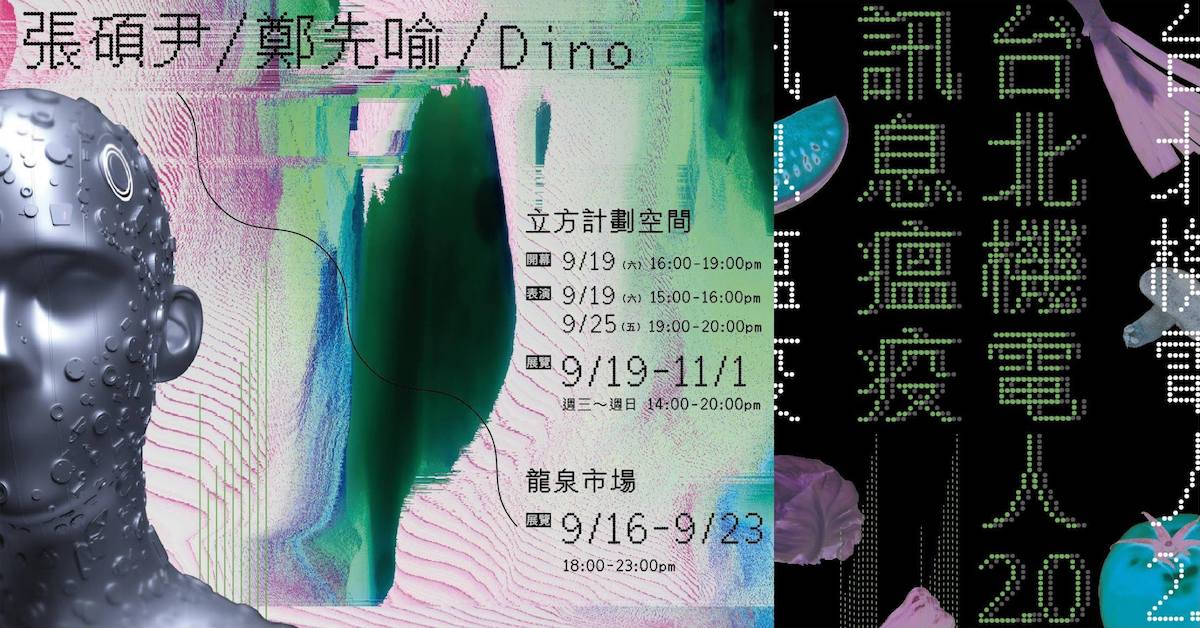 若當時你有收到《同化者》展覽的電子邀請函,定會記得那封邀請函是個彈出式網頁。在讓人有彷如電腦被駭體驗的同時,網頁中顯示的是程式隨機截取的網路貼文串。這個擷取的形式,也被應用在近期正在展出的聯展《台北機電人 2.0:訊息瘟疫》上。由鄭先喻所設計的網路酸文訊息擷取裝置收到擷取訊號後,這些訊號會傳至另外兩個展區:於立方計劃空間展區中,由藝術家張碩尹使用傳統市場蔬果廢料製作的音聲裝置,收到訊號會發出不諧和的聲響;於古亭龍泉市場的展區中,訊號將促使現場設置的裝置噴散香水,結合市場裡的燈光裝置,改變觀展者在傳統市場行走的空間體感、印象。