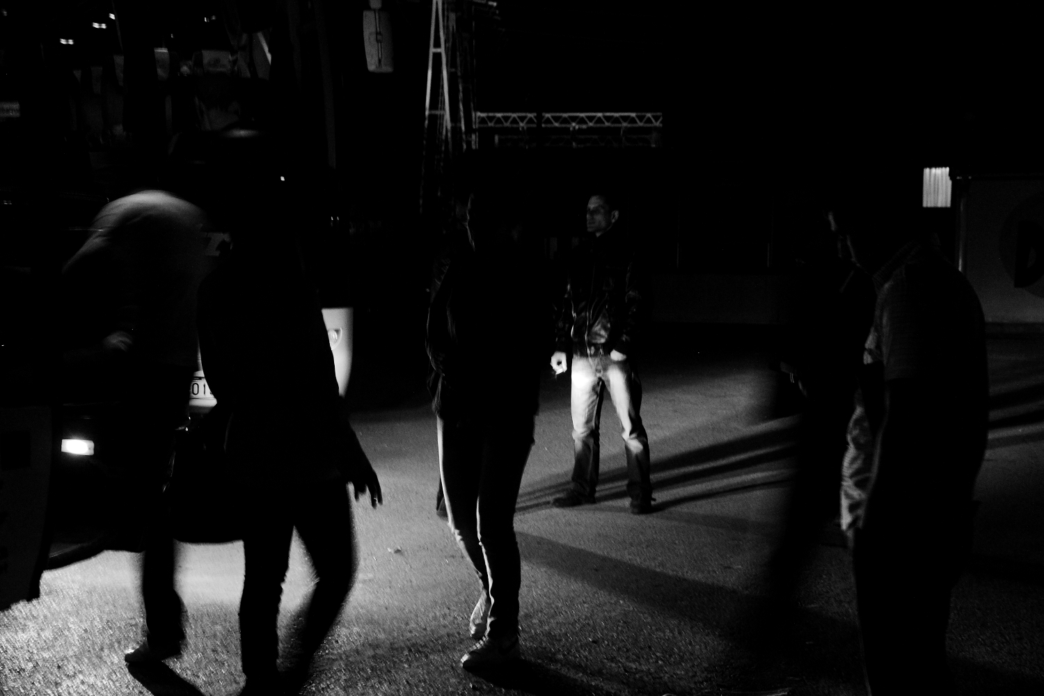 已是晚間十點,車內僅開數盞小燈,熒點渺渺;我在車後方,從頭與頭的縫隙間看過去,想像自己是深海無光帶、不見天日的盲魚,跟隨一群不知是敵是友,放著生物螢光的怪物奮力前游。