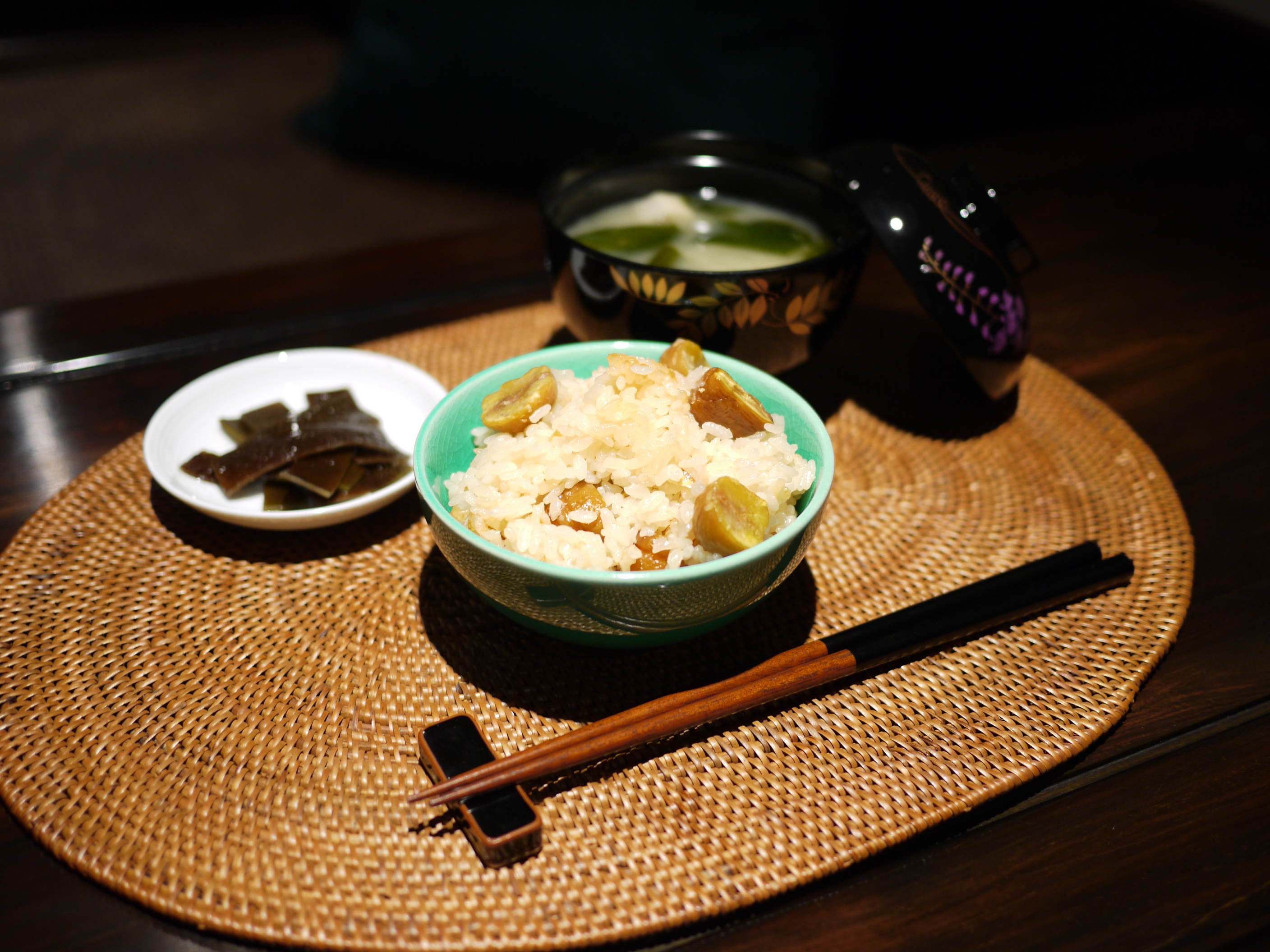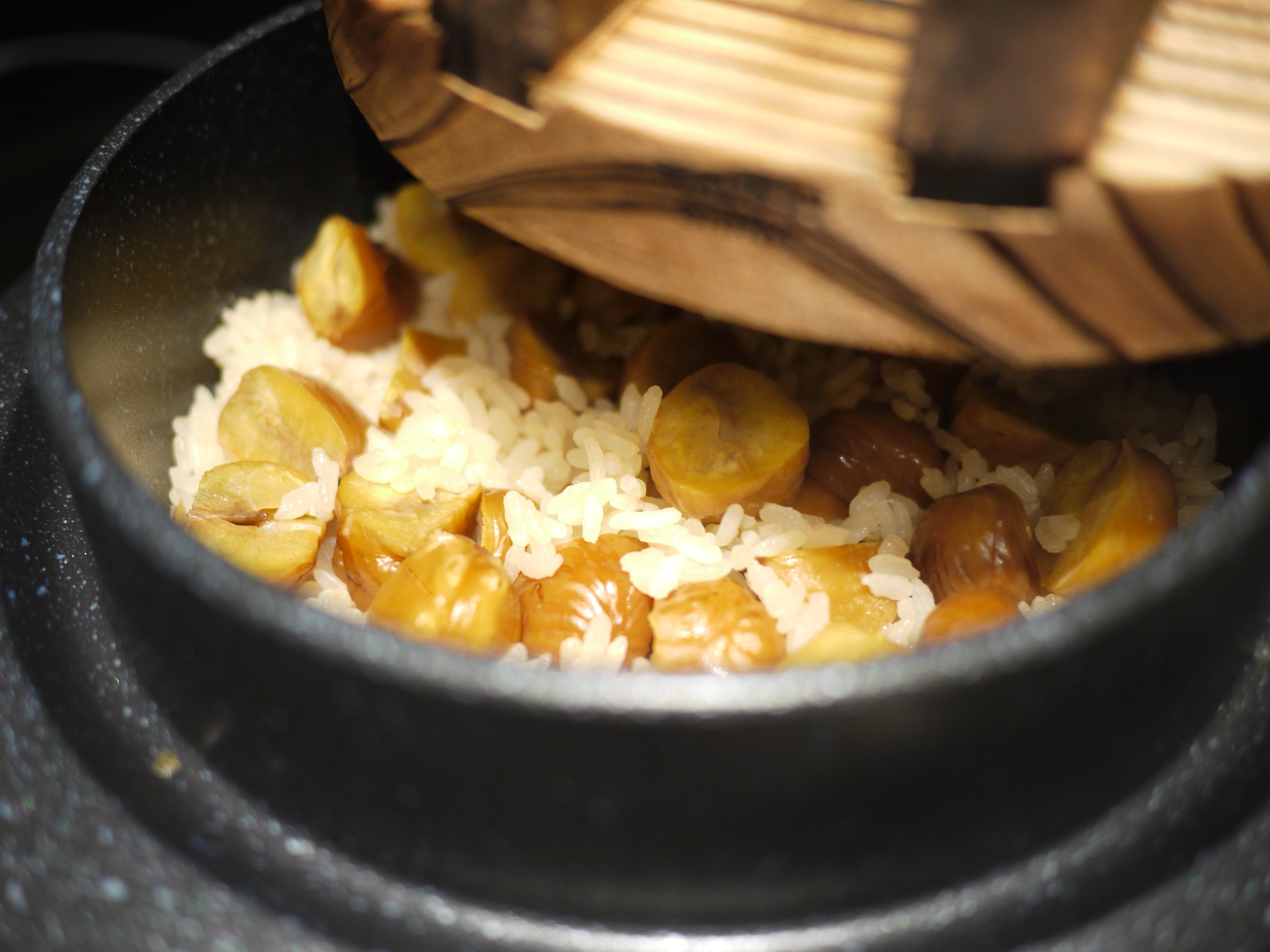 萬事俱備後,就剩下炊飯的動作了。將泡好水的米和糯米混合,加入昆布水、清酒、鹽、薄鹽醬油,最後將栗子覆蓋其上,即可開始炊飯。至於炊飯之器具,用電鍋當然是最方便,只要按下開關,跳起後再按一次,炊煮兩次後即完成。但我另外添購了炊飯專用的飯釜(註一),除了美觀與增添情趣,直接在瓦斯爐或電磁爐上炊出來的飯亦會產生焦香的鍋巴,是我無法抗拒的美味。用飯釜炊飯,謹記以下步驟:一開始先用中大火讓水燒滾,水滾後轉中小火繼續讓水收乾,待水快收乾時即轉小火悶煮 10 至 15 分鐘,飄出飯香即可關火。關火後,讓米飯續悶 10 至 15 分鐘,掀蓋後再用飯勺攪拌米飯(若能將米飯裝盛至大飯盆中攪拌攤平更佳),使多餘的水氣蒸發,米飯吃起來將更 Q 彈不黏牙。