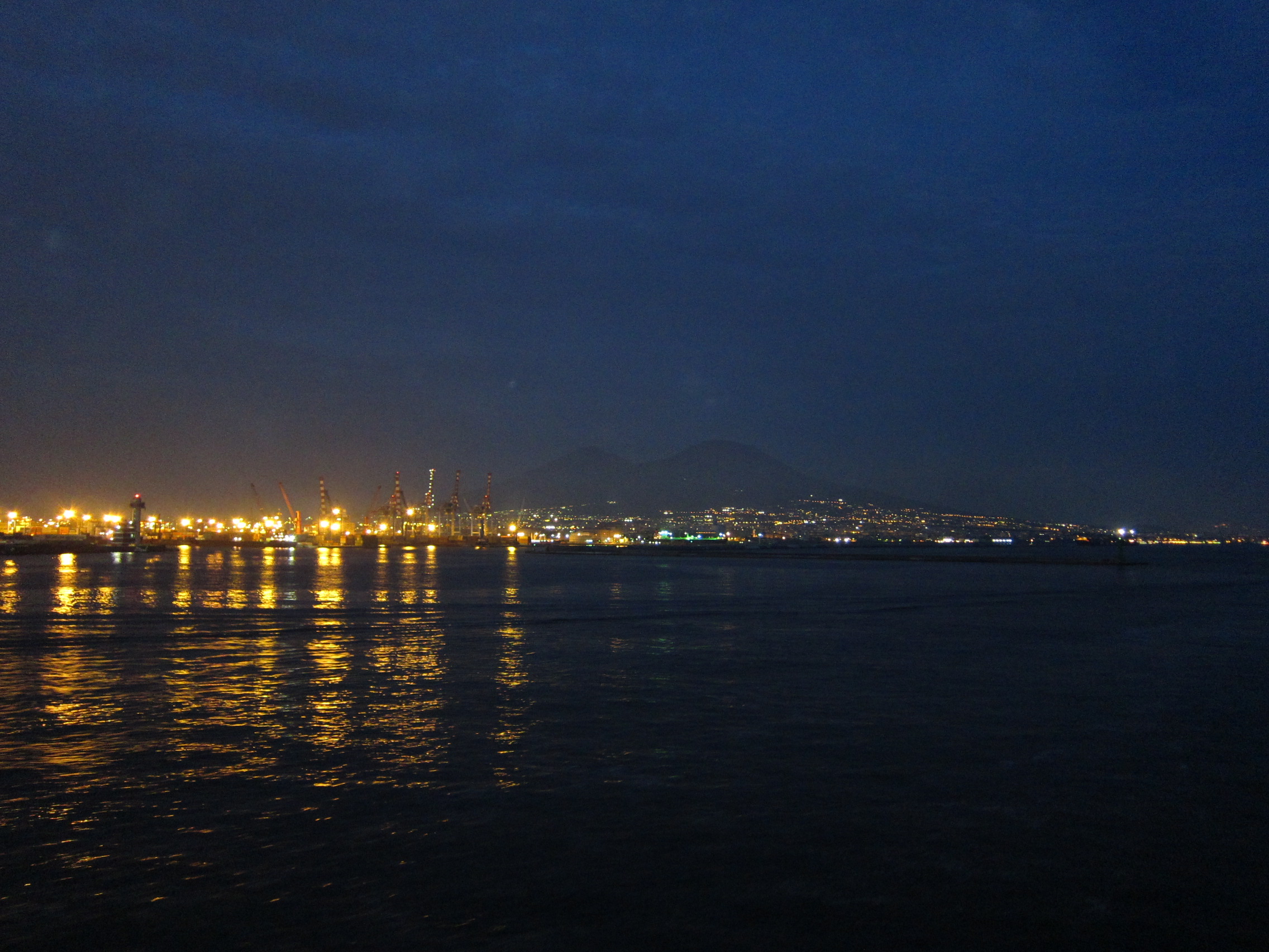 渡輪駛離拿坡里的時候天還沒有完全黑,回頭往港口看去,夜色中的維蘇威火山襯著前排的點點燈火,一輪明月高掛天空,此時此刻的拿坡里美極了。
