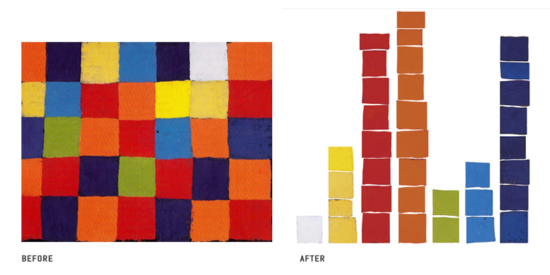 再看到來自德國的瑞士裔畫家——保羅.克利(Paul Klee)著名的色塊畫作(Farbtafel),對於 Ursus 來說,這樣的顏色排列非常沒有章法,為了回歸該有的秩序,應當將相近的顏色作為一個群組,同樣的再重新繪製成新的作品(如下圖)。