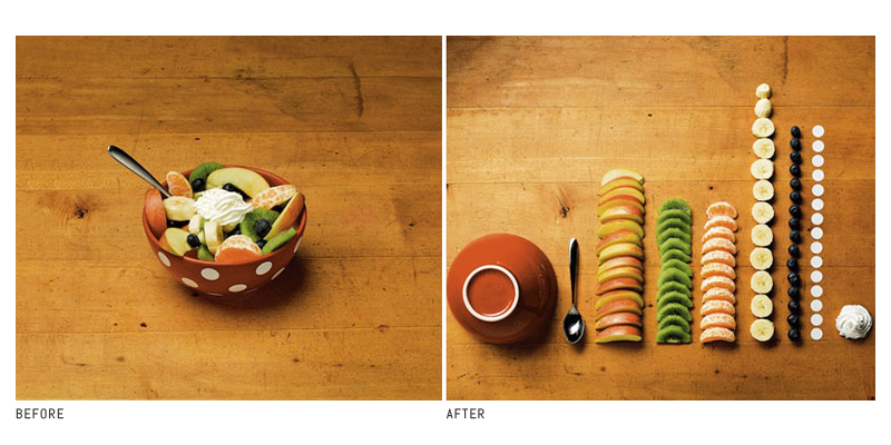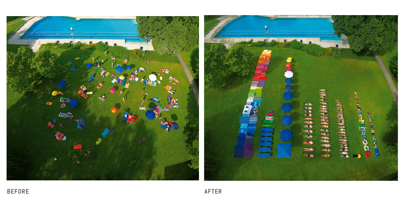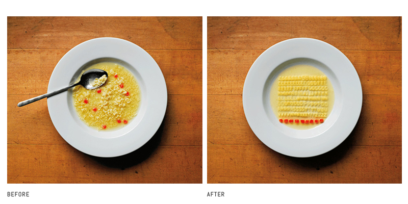 在新書《The Art of Clean Up》中,他將生活裡平凡的事物作為創作的主題,像是湯碗裡的字母麵、停車場的汽車、松樹的針葉、甚至夜晚的星空等,都成了他作品裡的主角。並不是每件作品都是透過 Photoshop 軟體後製,有些攝影作品是需要他親自指揮參與者,排列出他所構想的成果。井井有條下又帶有美感,帶有美感之餘又能讓人發出會心的一笑,這境界又比單純創作美麗事物來得更高一層。Ursus Wehrli 的創作態度讓我體悟到:藝術是生活,生活是藝術。很多時候不需要太嚴肅來看待人、事、物,當你換個幽默的角度去看事情時,會發現無聊的事情也變得有趣,太陽底下的確天天都有新鮮事。以下為幾幅來自《The Art of Clean Up》中的作品,就讓我們好好玩味 Ursus Wehrli 的創意吧!