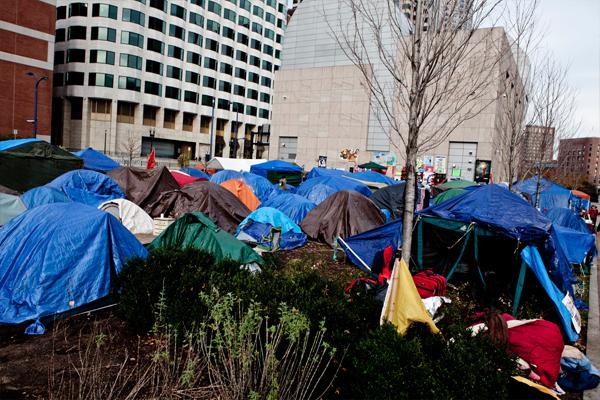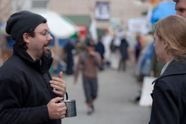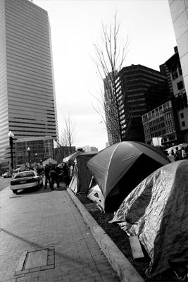 人們很容易批評這類抗議活動。因為他們組織的鬆散,訴求的矛盾或是他們意志無法貫徹。Occupy Boston 也不例外。我拍攝的營地在中國城外面,到的時候剛好是他們免費大學開課。但其實也就是一群人在一個土坡上聽演講而已。當一位白人女性正要開始宣讀有關女性的權益,忽然有個五十多歲的黑人男子也衝上了台,不知道念著什麼。接著兩個人就吵了起來。我問旁邊的一位中年男子,他們到底在爭執什麼?他說那個黑人認為不能只談女人的權益,男人的權益跟黑人的權益怎麼辦?我感覺這有點是來亂入的。但是主辦的單位與台下的聽眾其實也不清楚不妥之處在哪裡。Occupy 就是這樣一個活動。