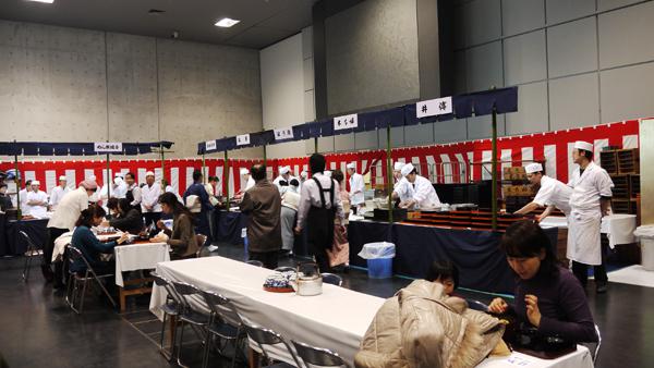 不知是否為了因應正月人們享用佳餚的需求,每年十二月中旬,會舉辦由「京都料理協會」主導的「京料理展示大會」。別以為這為期兩天的展示會是餐廳打廣告的噱頭罷了,這個展示會由明治九(1876 年)年起開始舉辦,竟然已有一百多年的歷史,2011 年為第一百零六屆。據說起源是由於明治維新後,中央政府遷至東京,京都料理人們擔憂歷史悠久的「京料理」面臨存亡危機。而且這些「京料理」的技法,常常又是傳子不傳外,並且只靠口授、不留文字,因此料理店們一同做了個劃時代的決定,每年舉辦展示大會,公開自家料理,彼此切磋技藝。當然,比起這些創業好幾百年的老舖來說,京料理展示會一百多年的歷史,不過只是大河旁邊的小支流而已……。現今的展示會,除了協會的各家餐廳,卯足勁來擺設自家得意佳餚,還有幾間料理名店現場以低價提供精緻便當,以及販賣各類食材、食器的攤位,舞台上更有舞妓的「京舞」表演、宮中以庖刀進行的儀式「生間流式包刀」示範、名店廚師現場指導京料理等。