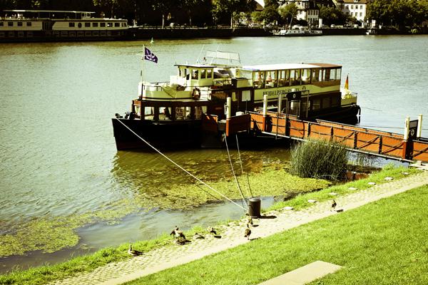 在遲暮之時從疲憊的德鐵走下來,沿途風光難以計數,從萊茵河下游的大城 Köln 逆流而上,經過了乘載著德意志驕傲的 Koblenz,轉搭 KD(Köln-Düsseldorf)準備到前往南部的海德堡,一路上萊茵河的美不因陰天而減損,河的兩岸有時是傳統的建築零星散落著,有時則就那麼單純地蓊蓊鬱鬱,翠綠色的森林夾著河岸向前延伸著,這一整個午後就這樣毫無預期地將自己浸入這國家最美的河段,一面想起了答應過要在最美的地方把卡片寄給朋友,河畔徐風迎面而來的美好讓人不忍提筆,深怕低頭書寫的瞬間又錯過了一些什麼。