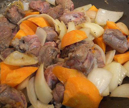 3. 利用剩下的油炒洋蔥跟西洋芹紅蘿蔔,放入鍋中炒到表面變咖啡色為止。再將蔬菜整鍋倒到燉鍋裡面,把培根放回鍋中,牛肉再鋪在蔬菜跟培根上面,灑上鹽與黑胡椒,並均勻灑上麵粉,全部沾滿後牛肉翻面再灑一次。(這三樣蔬菜的混合法文叫做 Mirepoix,也可以稱為西式蔬菜三寶,是西餐中調味很重要的基底蔬菜。)