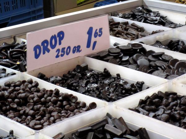 這個荷蘭人稱為 drop 的糖果,是由名為 liquorice 的甘草根部萃取製成,黑色的,有甜有鹹,但唯一不變的主要味道,就是那股濃膩的甘草甘味。具體一點的形容,就是如同瓜子殼以及八角的味道。有一次荷蘭同學請我吃這種糖,雖然他理解很多外國人無法接受 drop 的味道,一直跟我說不喜歡就吐掉沒關係,但我還是忍住這股怪異的味道,直到糖果在我嘴裡融化消失,留下黏膩而久久揮之不去的八角味。我個人並不排斥八角味,但是對於這種味道要我以「糖果」視之並且含在嘴裡持續 10 分鐘之久,我想對於很多人來說絕對是怪異且無法忍受的。但對於荷蘭人來說,這可是生活中不可或缺的零嘴,這點從超市、糖果店和市集裡 drop 的分佈就可感受到它對荷蘭人的重要性及受歡迎程度,不吃不可!