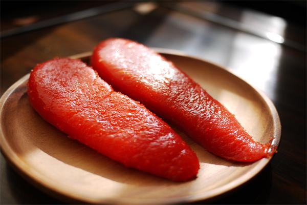 明太子,實乃醃漬過後的鱈魚卵,將新鮮的鱈魚卵置入由日本酒、昆布、柴魚、醬油、砂糖所調製而成的醃料裡,若要製作辛子明太子(辣味明太子)則加入辣椒粉,醃製約一週即成。至於明太子之所以被稱作明太子,實為古代中國及朝鮮將阿拉斯加鱈魚稱作「明太」,明太魚的魚子就是「明太子」。從其語源亦可了解,明太子原為朝鮮半島之食品,朝鮮半島自古即有醃漬明太魚卵(「明卵漬」)之傳統;二十世紀初日俄戰爭的勝利使日本展開對朝鮮之控制與統治,朝鮮的明卵漬亦開始輸入日本;至二次大戰後,鄰近朝鮮之九州福岡縣成為日本製造明太子之著名產地,發源於朝鮮之明太子,亦經過日人之口味改良,隨著山陽新幹線之開通,普及於全日本,成為深受日人喜愛之配菜。