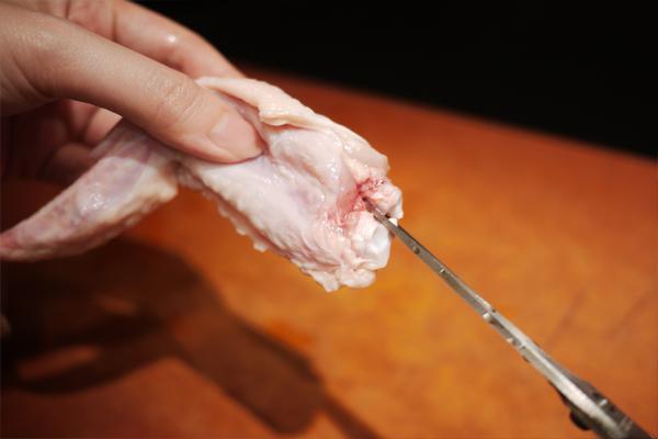 我建議買兩節雞翅,買三節的話還得處理那小棒腿,雖然可以順便變出另一道佳餚,但若你沒這閒功夫,就從簡吧。先將兩節雞翅間的關節折斷;粗的那段雞翅裡有兩根骨頭,一粗一細,用剪刀將前端連接兩根骨頭的筋剪斷,而後用剪刀將兩根骨頭周圍之筋肉自骨頭剝除。取兩張廚房紙巾,一張包住雞翅尾端,另一張抓住細骨頭,用力將細骨頭拔出,再用同樣方法將粗骨頭拔出。如此一來,你的雞翅就變成軟綿綿的無骨雞翅了,中間也多了塞入明太子的空間。