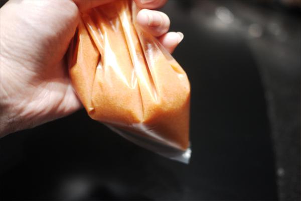 至於明太子,一般日系超市除了販賣兩條或三條一份的盒裝,亦有散狀的明太子。若你購買的是散狀的明太子,則可直接擠入雞翅中;若你購買的是整條整條的明太子,由於外層有薄膜,必須先用刀縱向切開,再用刀背將明太子顆粒刮出,置入塑膠袋中,底部剪一小缺口,做成簡易的擠袋。將擠袋中的明太子擠入雞翅中,小心不要擠太多,因為烘烤時雞翅會縮小、明太子也會膨脹,因此需視雞翅大小擠入適量。
