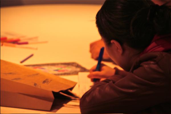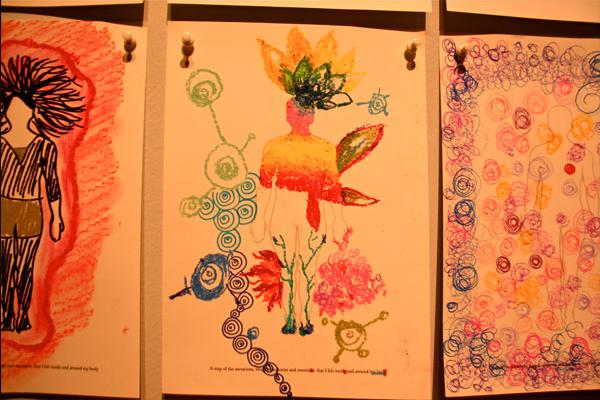 走上漆黑的二樓,牆上播著奇幻的影片,轉進幽暗的房間裡則是喬治.庫特(George Poonkin Khut)的 〈心靈圖書館〉。人可以躺在床上,看見頂上有面鏡子出現自己生命的絢麗色彩,透過光線、音效、顏色來代表不同的心理狀態,讓觀眾在黑暗之中感受自身生命的律動。再拐個彎就是延續〈心靈圖書館〉的〈身體地圖〉,熱門可以將先前的體驗畫出來,成為藝術家作品的一部份。